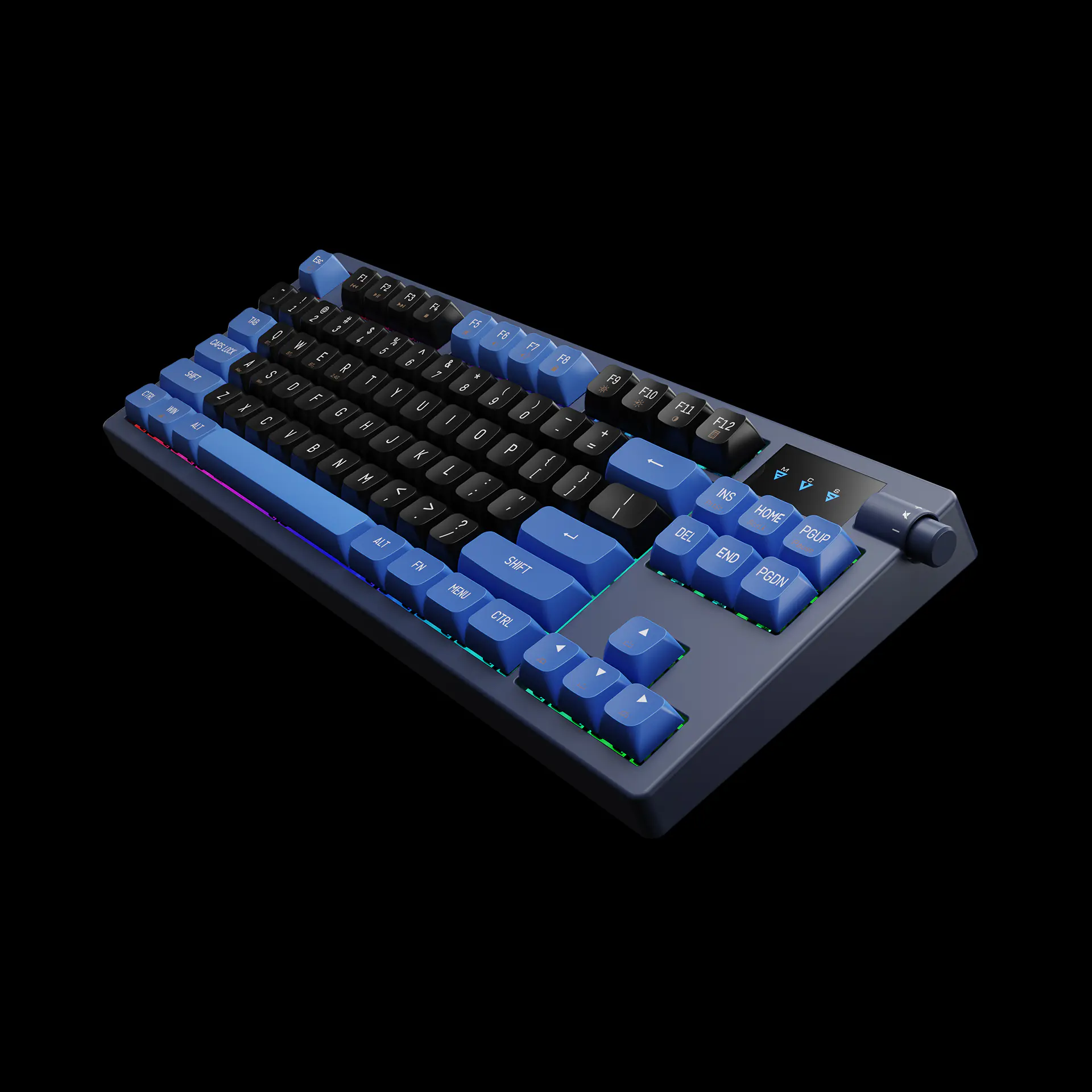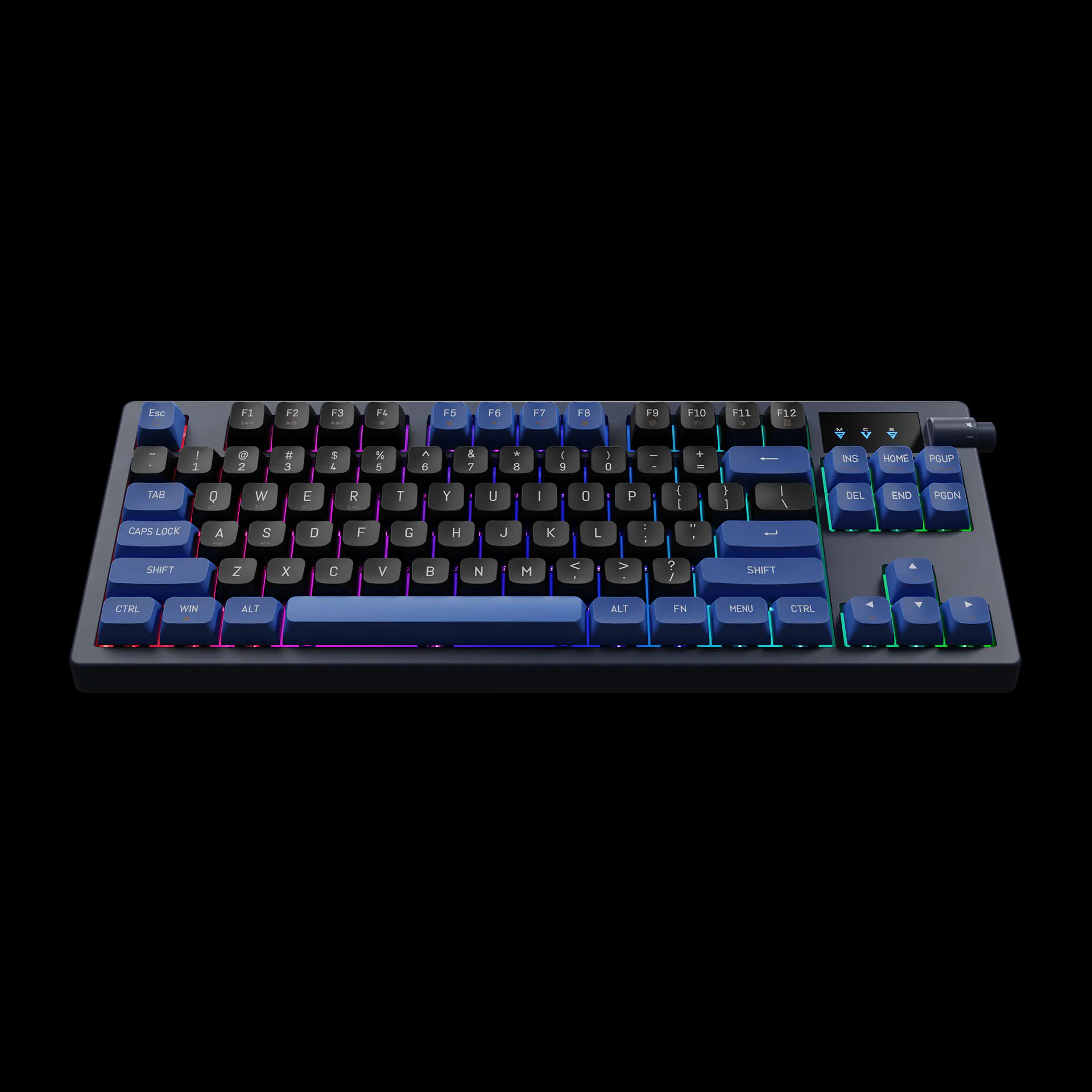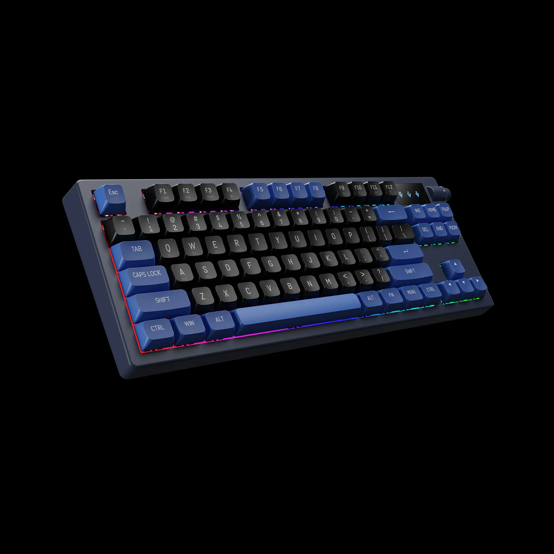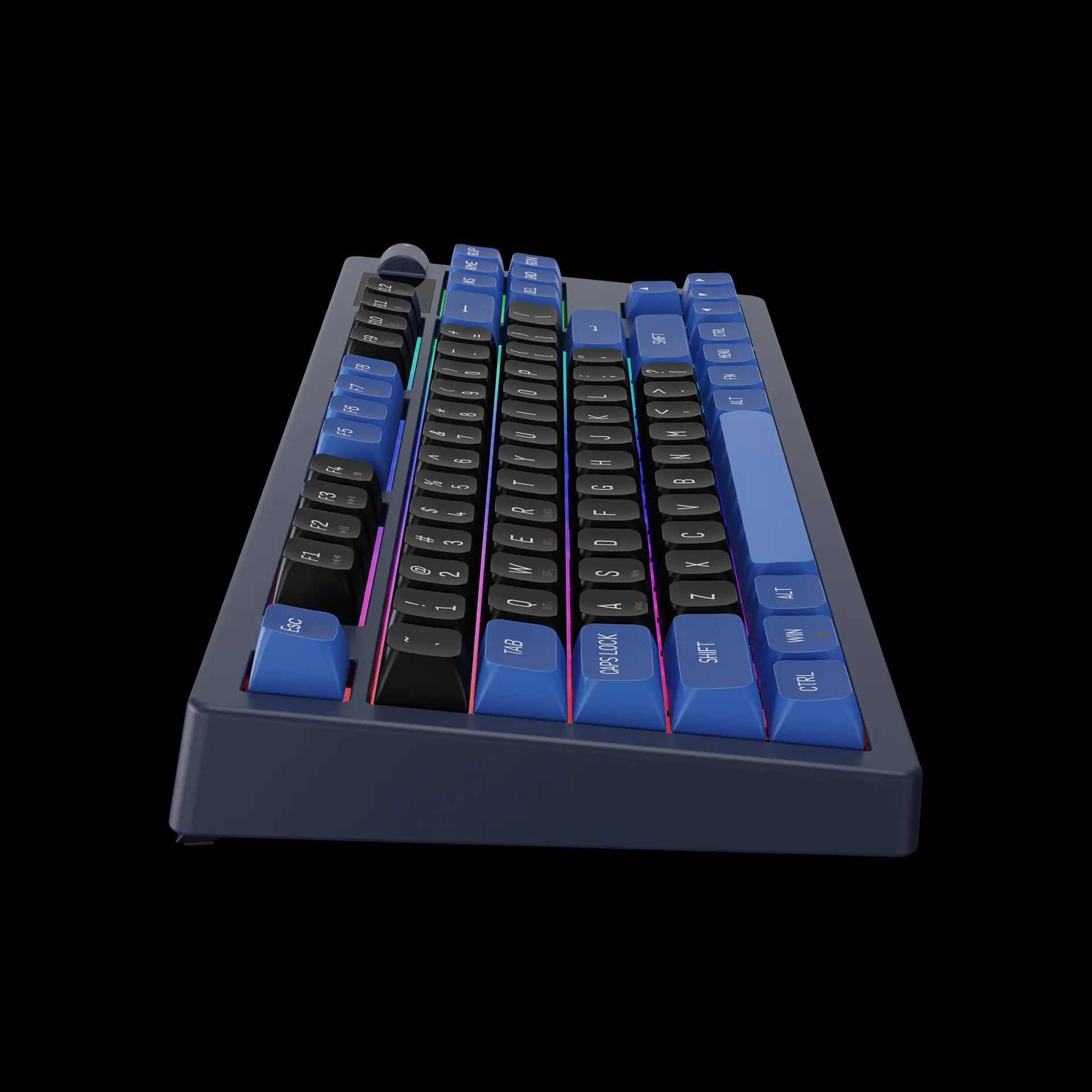 - Dual Colorway PBT Keycaps โ Matte black and royal blue in durable PBT that resists shine and looks elite.