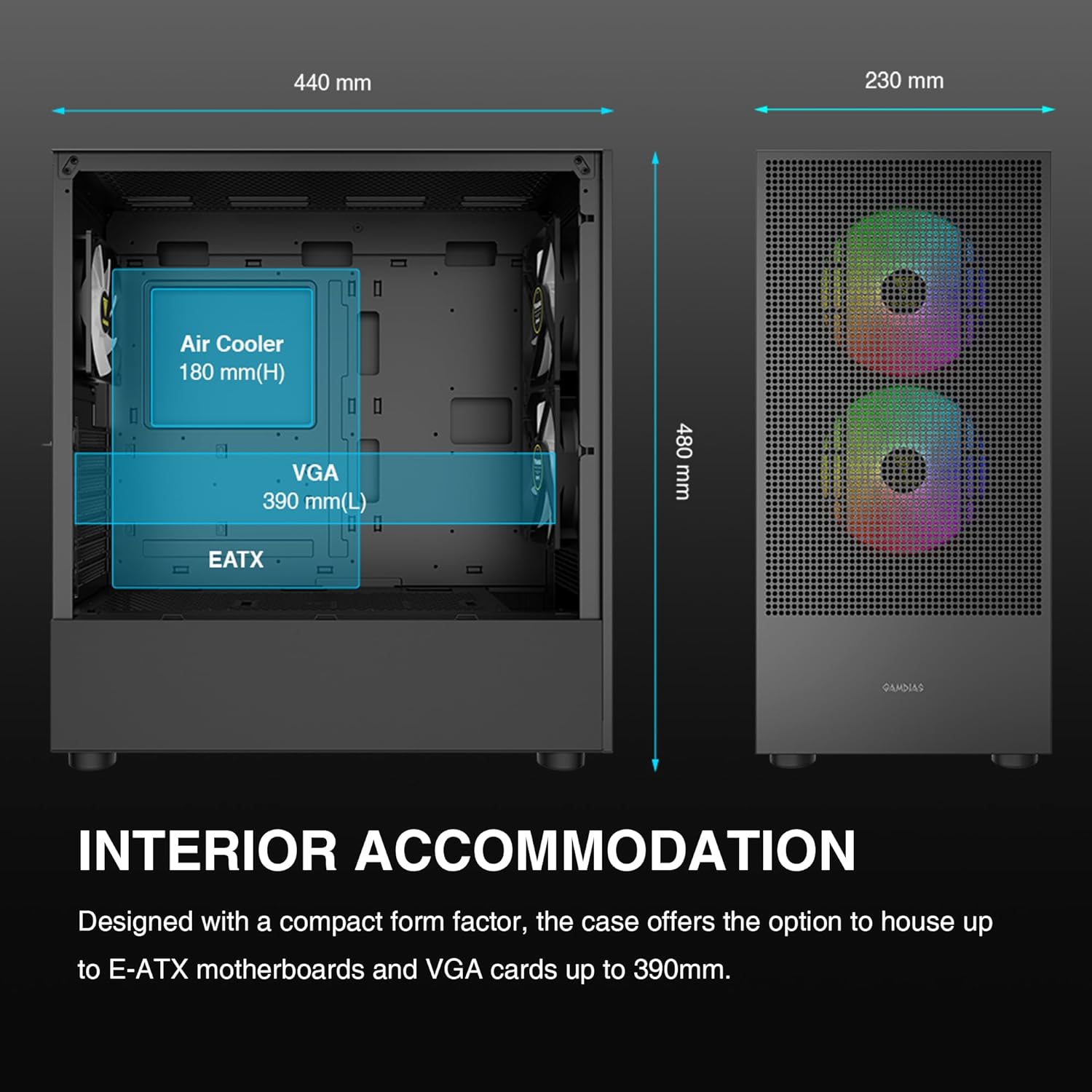 GAMDIAS TALOS E3 MESH ELITE PC CASE , ATX Gaming Computer Cases, Mid Tower, Pre-installed 3 ARGB PWM Fans , Tempered Glass Panel, Airflow Mesh, Support Dual 360 – BLACK