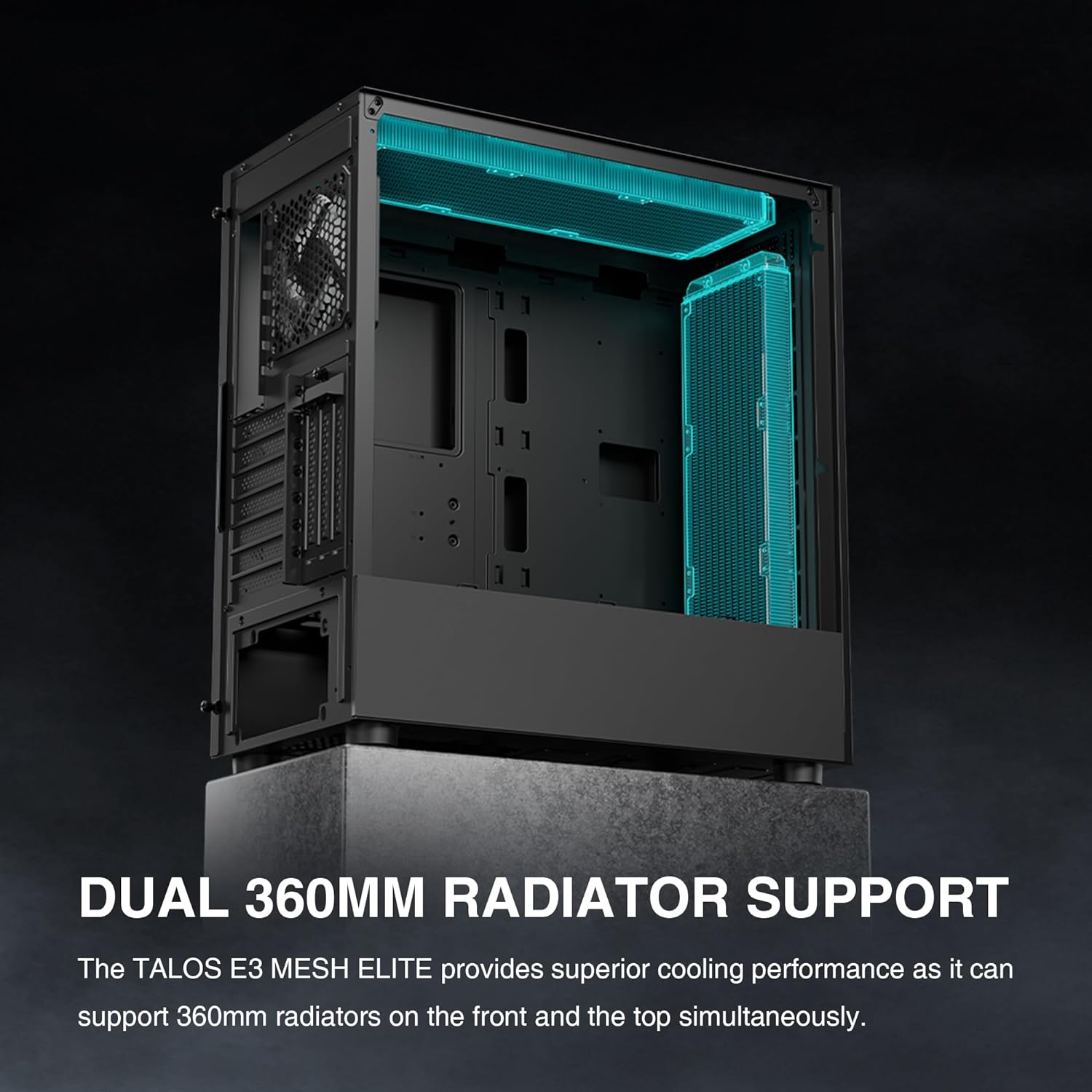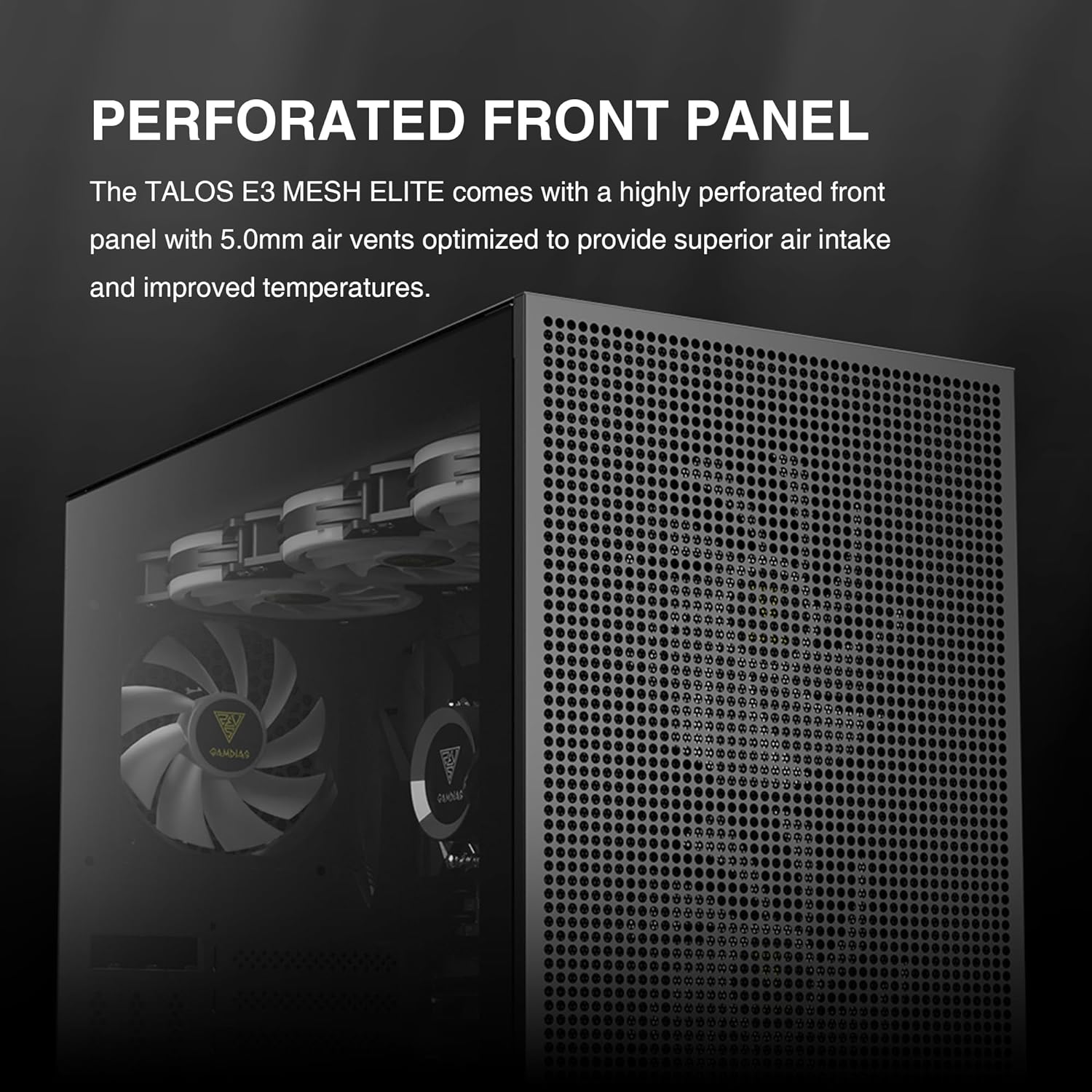 - Perforated Front Panel: The TALOS E3 MESH ELITE comes with a highly perforated front panel with 5.0mm air vents optimized to provide superior air intake and improved temperatures.
