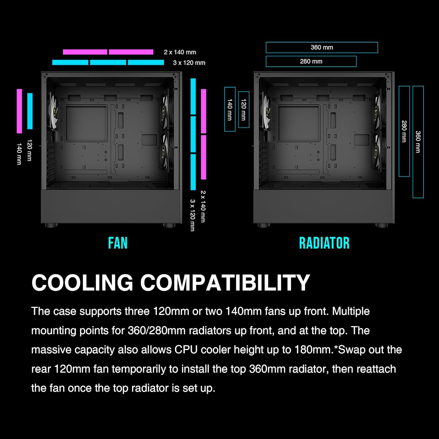 - Cooling Compatibility: The case supports three 120mm or two 140mm fans up front. Multiple mounting points for 360/280mm radiators up front, and at the top. The massive capacity also allows CPU cooler height up to 180mm.