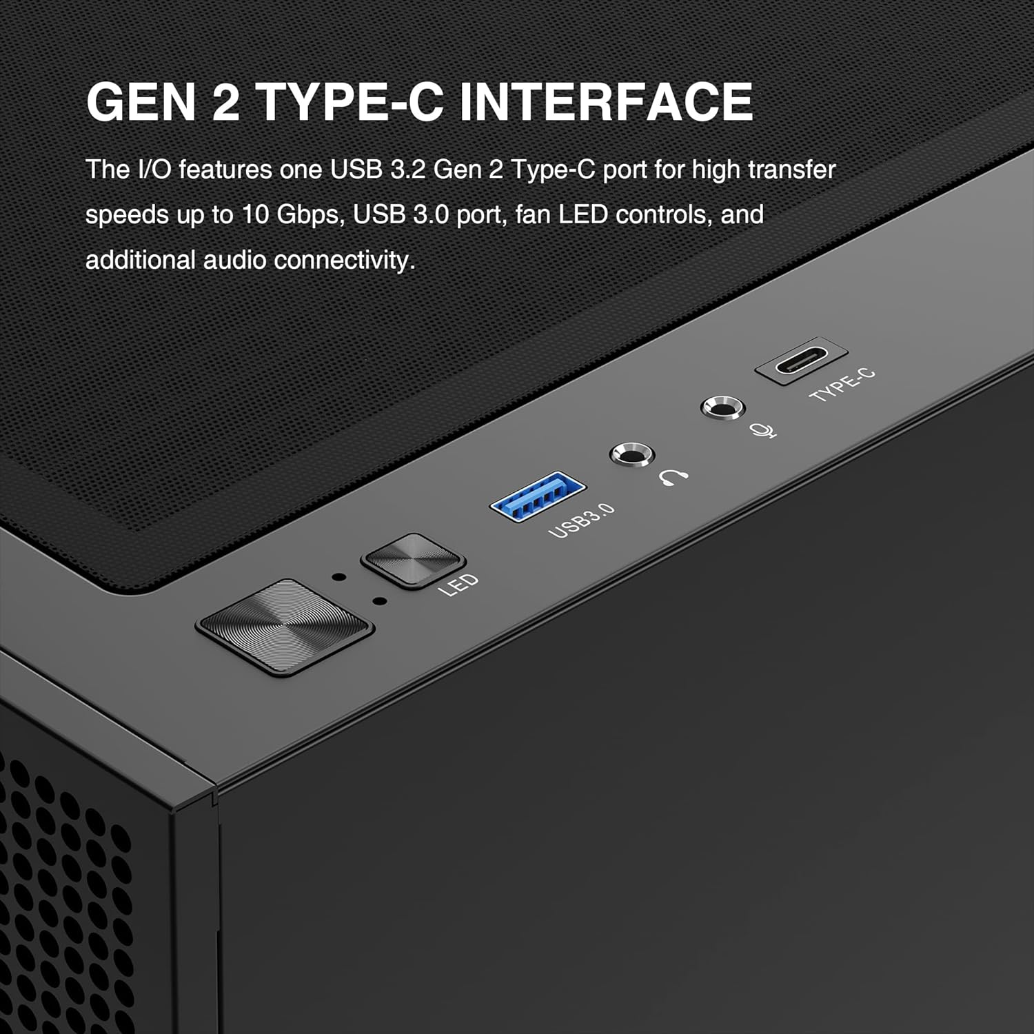 - Gen 2 Type-C Interface: The I/O features one USB 3.2 Gen 2 Type-C port for high transfer speeds up to 10 Gbps, USB 3.0 port, fan LED controls, and additional audio connectivity.