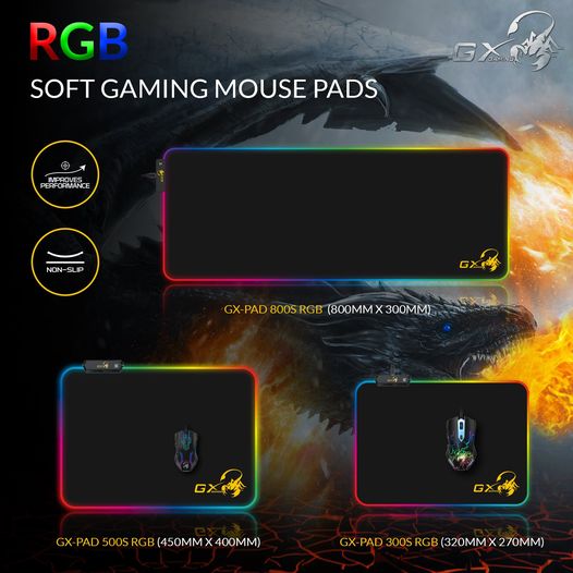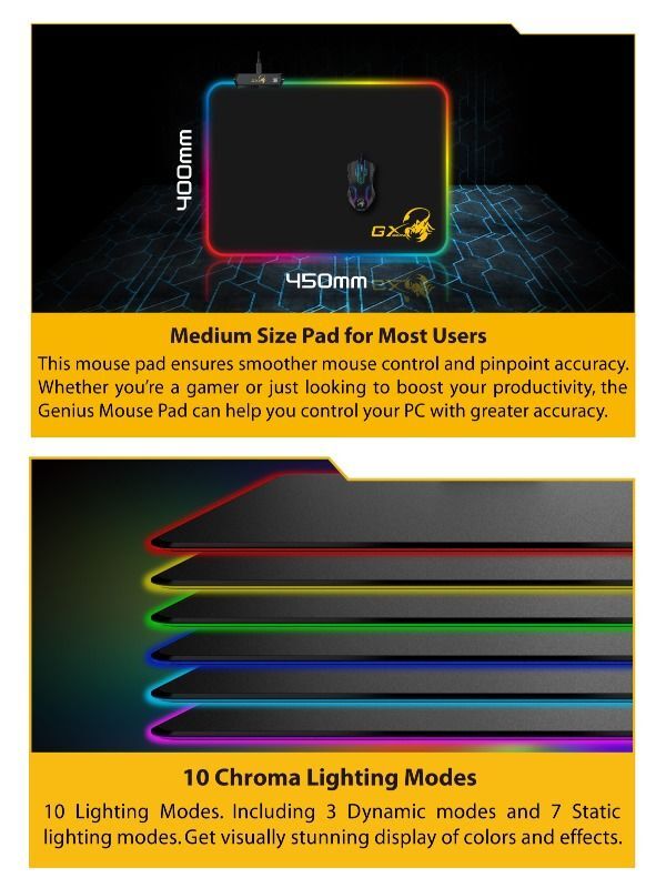 Genius GX-PAD 500S RGB Gaming Mouse Pad , Included 1.8m USB Cable – 3 Dynamic RGB modes and 7 Static lighting modes – Premium Smooth Surface, Non-Slip Rubber Base – 450 x 400 x 3mm