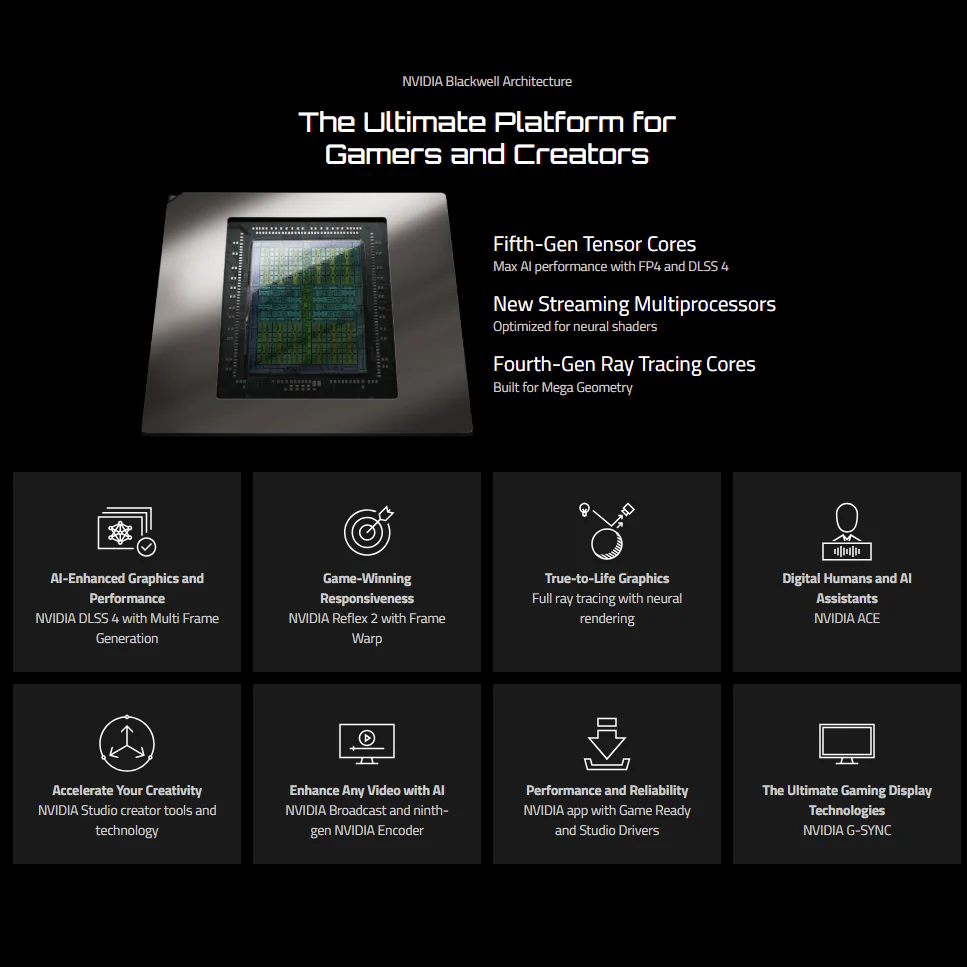 - Powered by NVIDIA Blackwell Architecture: Built for next-gen gaming and creative workloads with DLSS 4, Reflex 2, and AI-enhanced rendering.