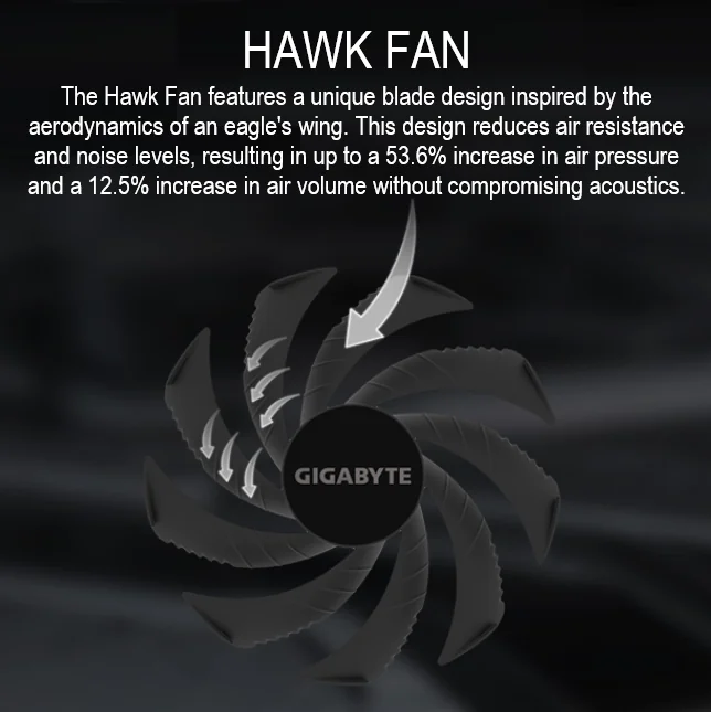 - WINDFORCE Cooling System: Advanced thermal solution featuring alternate-spinning Hawk fans, copper plate, composite heat pipes, 3D active fans, and screen cooling.
