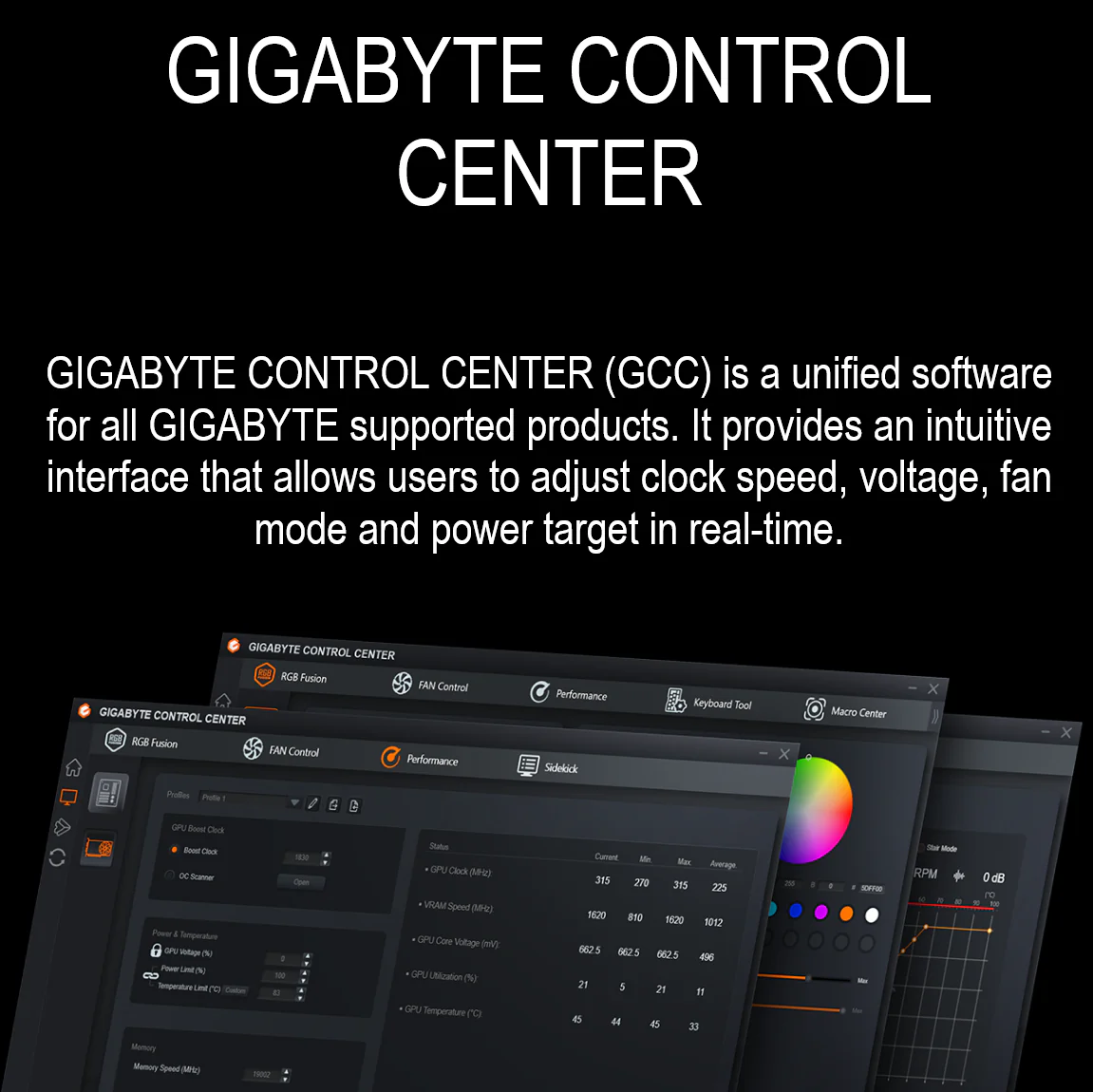 - Real-Time Tuning: GIGABYTE Control Center (GCC) lets you tweak clock speeds, voltages, and fan modes on the fly.