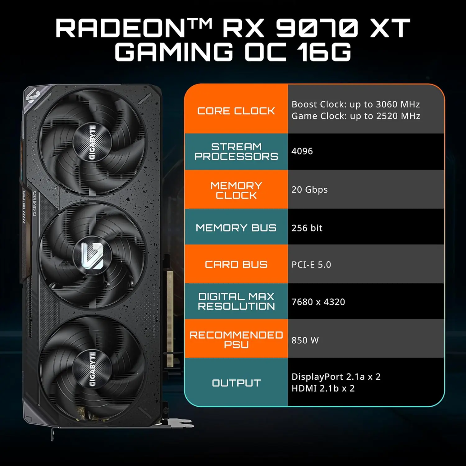 Gigabyte Radeon™ RX 9070 XT GAMING OC 16G GPU With 3060MHz Boost Clock, 16GB GDDR6, PCIe 5.0, WINDFORCE Cooling, RGB, Dual BIOS, DisplayPort 2.1a, HDMI 2.1b | BLACK GV-R9070XTGAMING OC-16GD | 1 YEAR WARRANTY