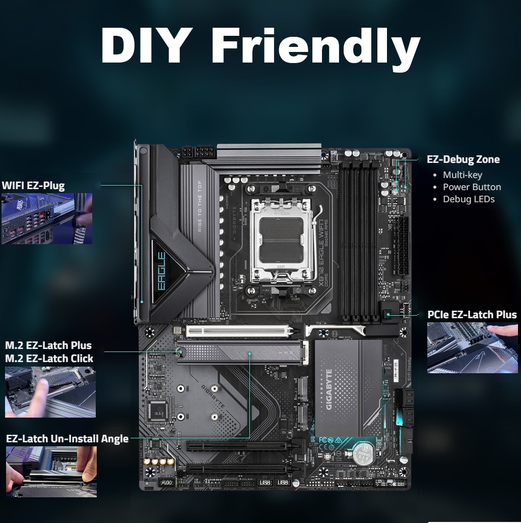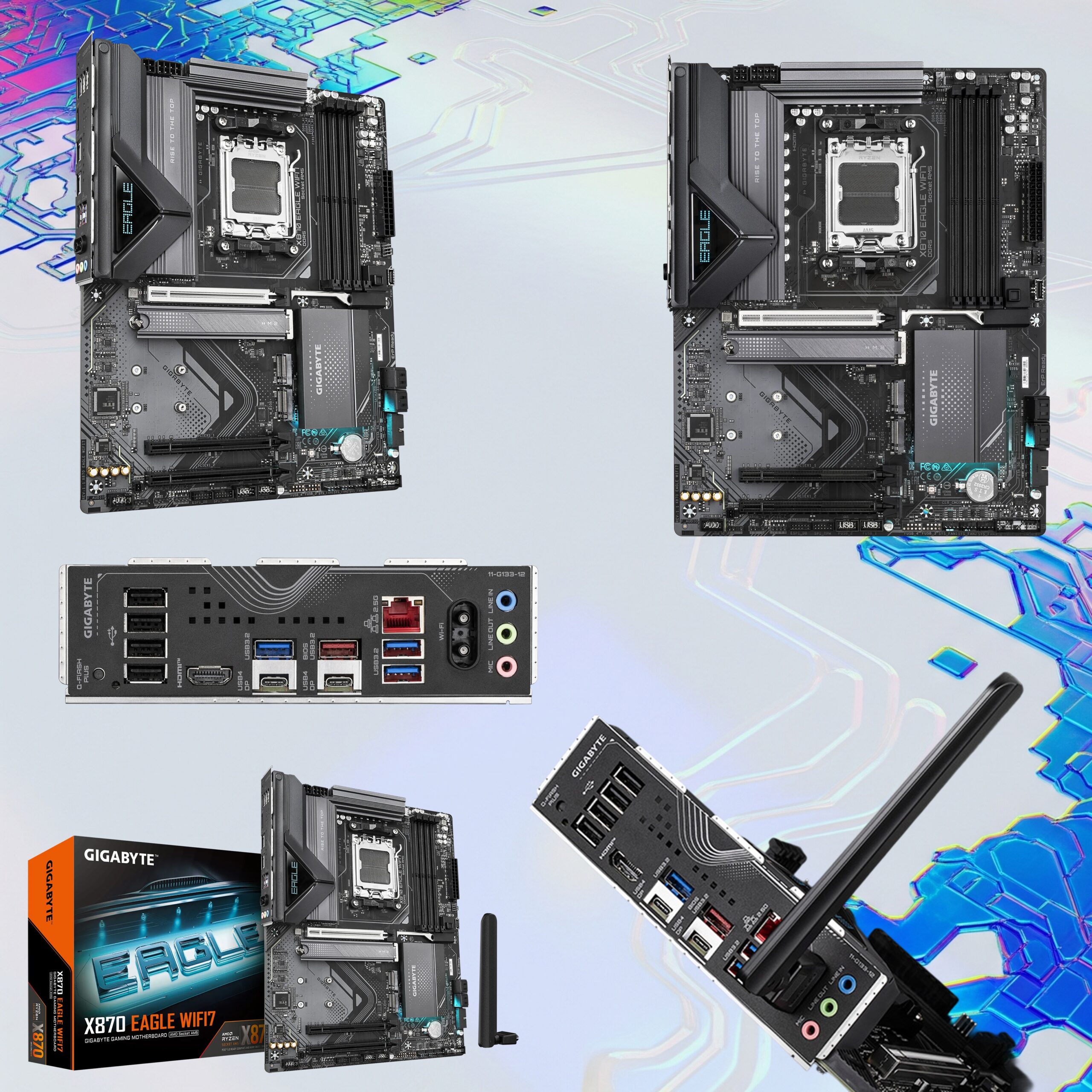 GIGABYTE X870 EAGLE WIFI7 ATX Motherboard , AMD AM5 DDR5 , 8200 MT/s OC , PCIe 5.0 M.2 , Dual USB4 Type-C , Wi-Fi 7 & 2.5GbE LAN , AORUS AI Snatch , EZ-Latch Plus , RGB Fusion for AMD Ryzen 9000 / 8000 / 7000 Series Processors