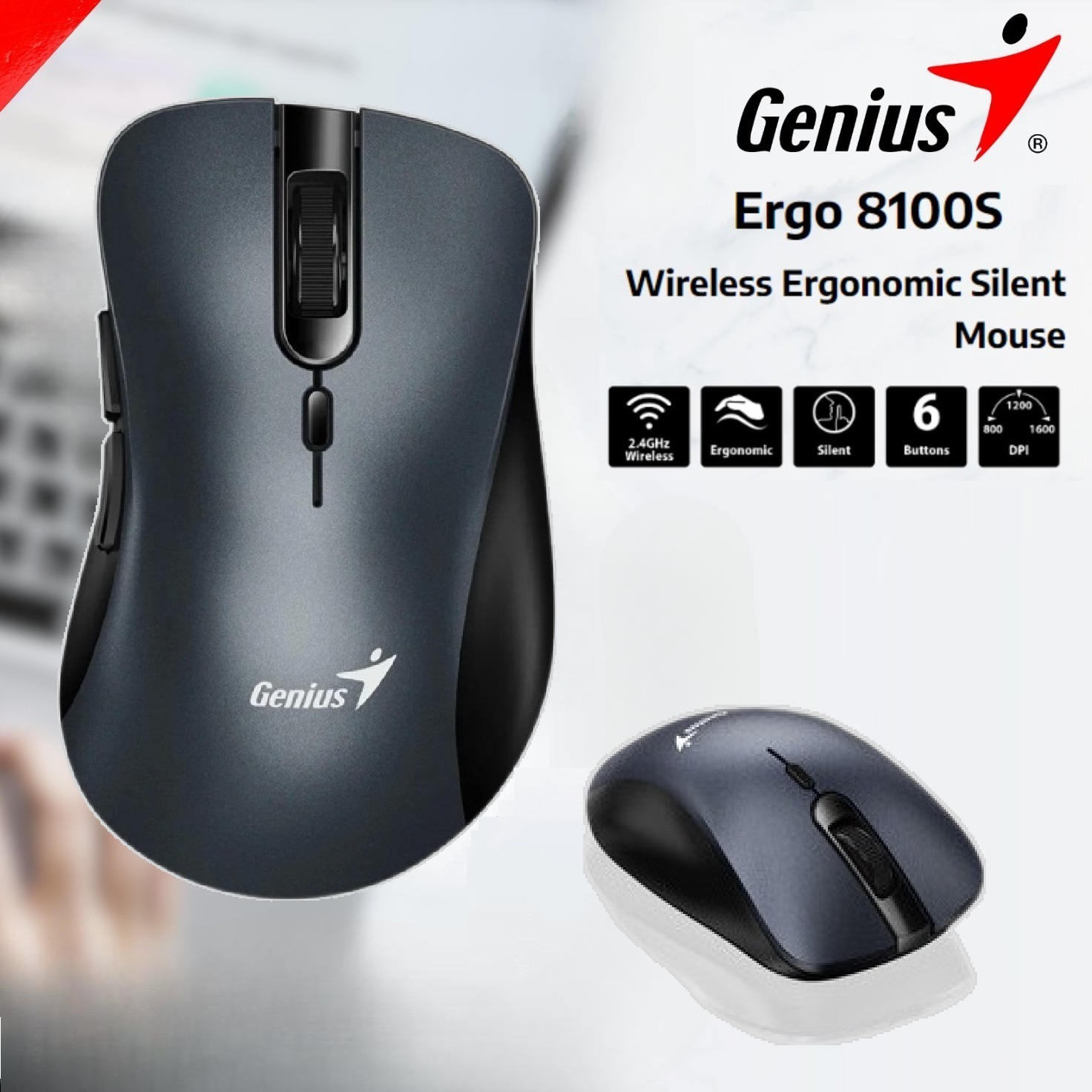 Genius ERGO 8100S Wireless Silent Mouse 2.4GHz – Ergonomic Right Handed – Silent Switch –  6 Buttons – Adjustable DPI 1600 – Compatible with Windows, Mac OS, and Linux OS | IRON GREY