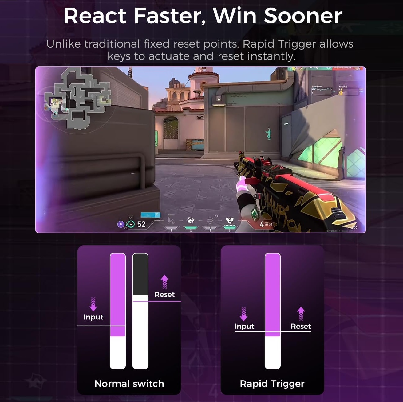• Rapid Trigger Mode : Instantly resets keys on upward travel to eliminate stiction and allow faster re-presses and directional switching.