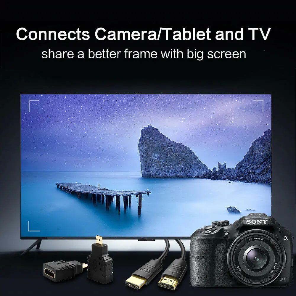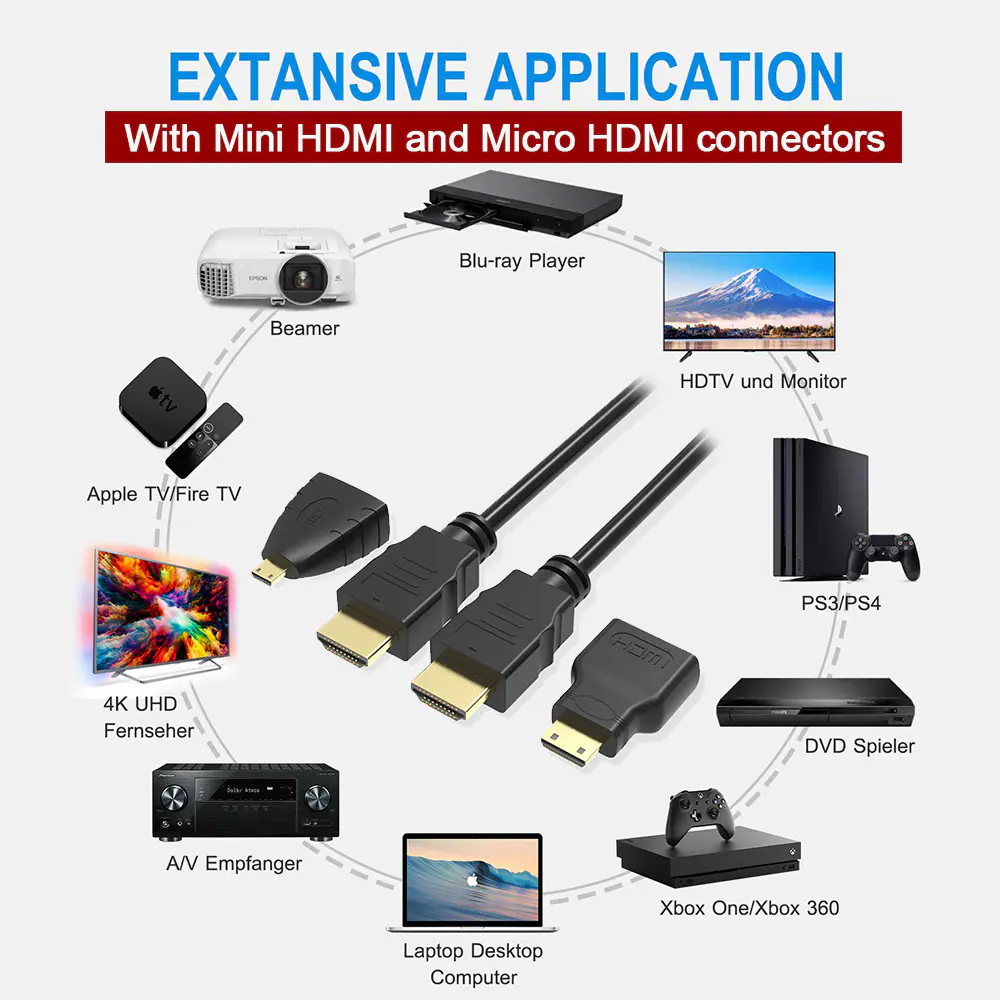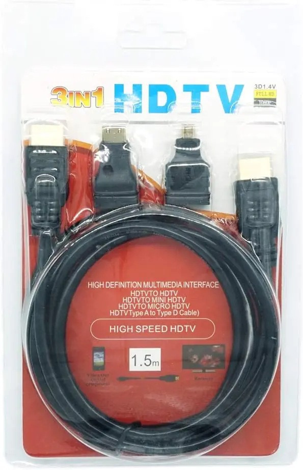 - 3 in 1 kit of 1.5M high speed HDMI to HDMI Cable + HDMI to Mini HDMI Adapter + HDMI to Micro HDMI Adapter. A must have accessory for those who would like to watch video and work on the big screen.