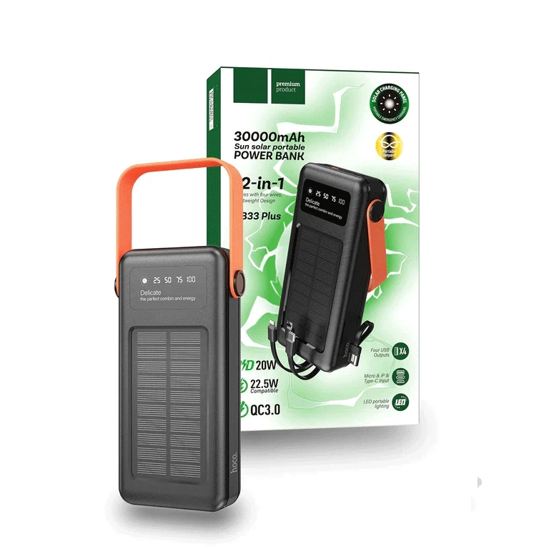 HOCO DB33 Plus Solar Power Bank 30000mAh with Built-In Cables, 22.5W Fast Charging, Multi-Port Output, LED Indicator, Portable Outdoor Charging Solution