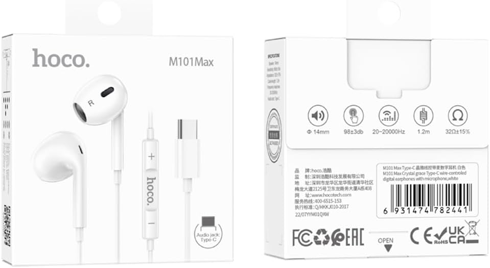 Hoco M101 Pro Crystal Joy Wired Earphones with Microphone – 14mm Drivers, Wire Control with Volume, 3.5mm Audio Jack, ABS+TPE Build, 1.2m Cable, Lightweight 29g Design, White