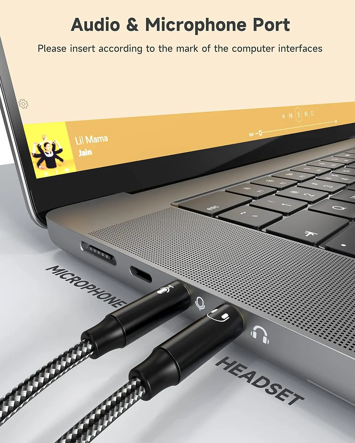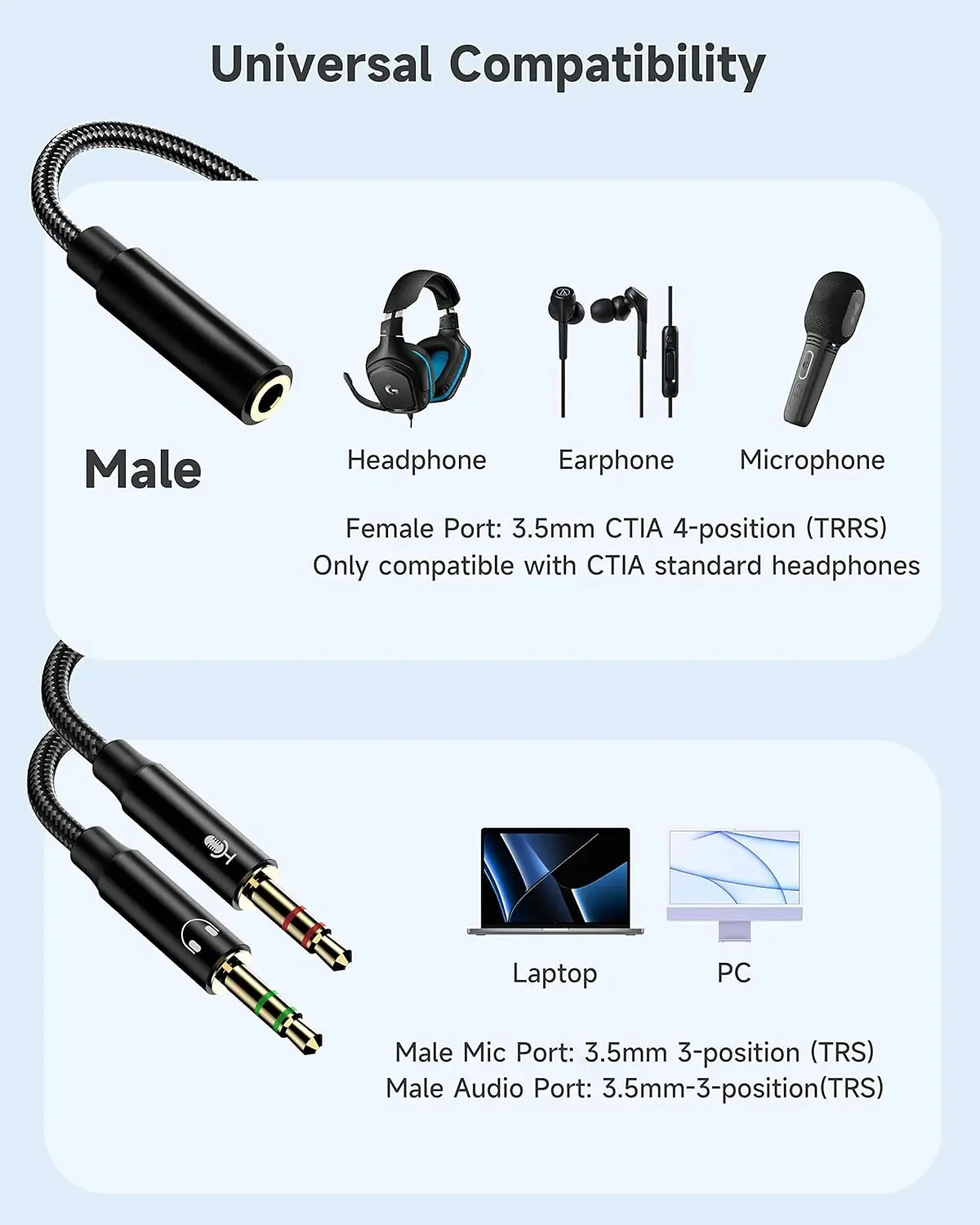 - Headset Splitter Adapter: splitter cable split a single 3.5mm female 1/8 inch jacks to 2 dual 3.5mm male stereo plug. easily connect a 4-position headset to your pc or computer that only had separate microphone and headphone jacks. note: the mic wouldn’t work for apple original earphone and beats headphone