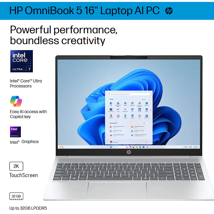 HP OmniBook 5  Intel® Core Ultra 7 255U | 32GB DDR5x RAM ; 1 TB NVMe SSD |  16 inch 2K IPS Touch Screen Display | Backlit Keyboard | Windows 11 |  Glacier silver 16-af1173cl