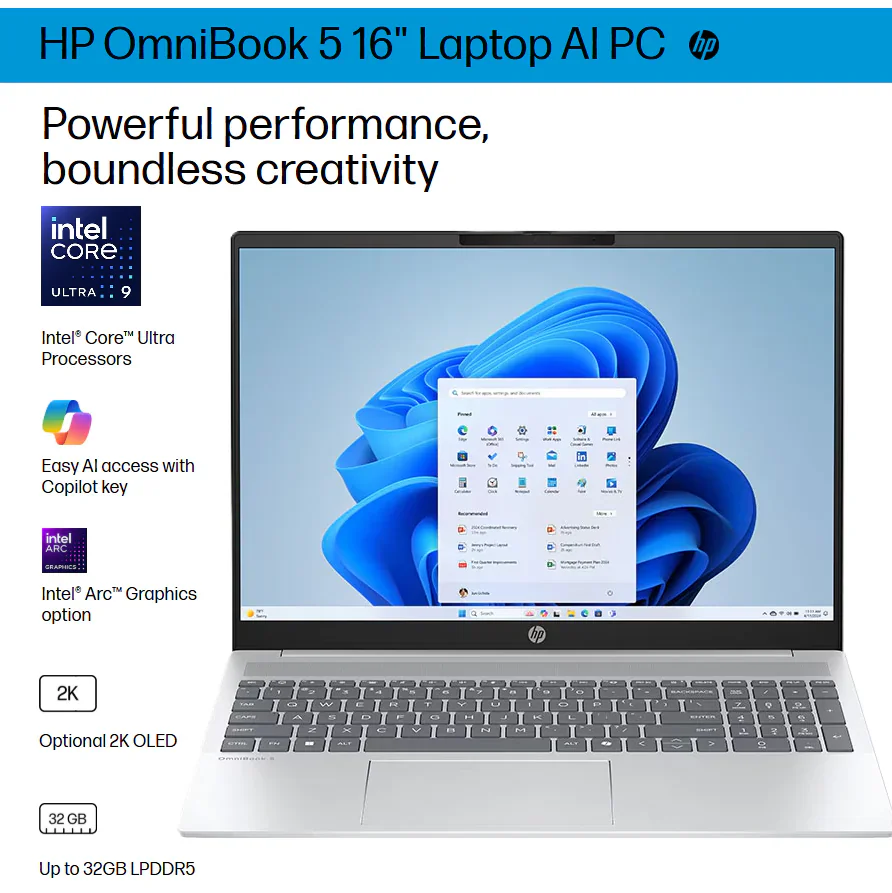 HP OmniBook 5 Intel® Core™ Ultra 9 285H | 32GB DDR5 RAM ; 1 TB NVMe™ SSD | Intel® Arc™ 140T GPU | 16 inch 2K IPS Touch Screen Display | Backlit Keyboard | Windows 11 | Glacier silver