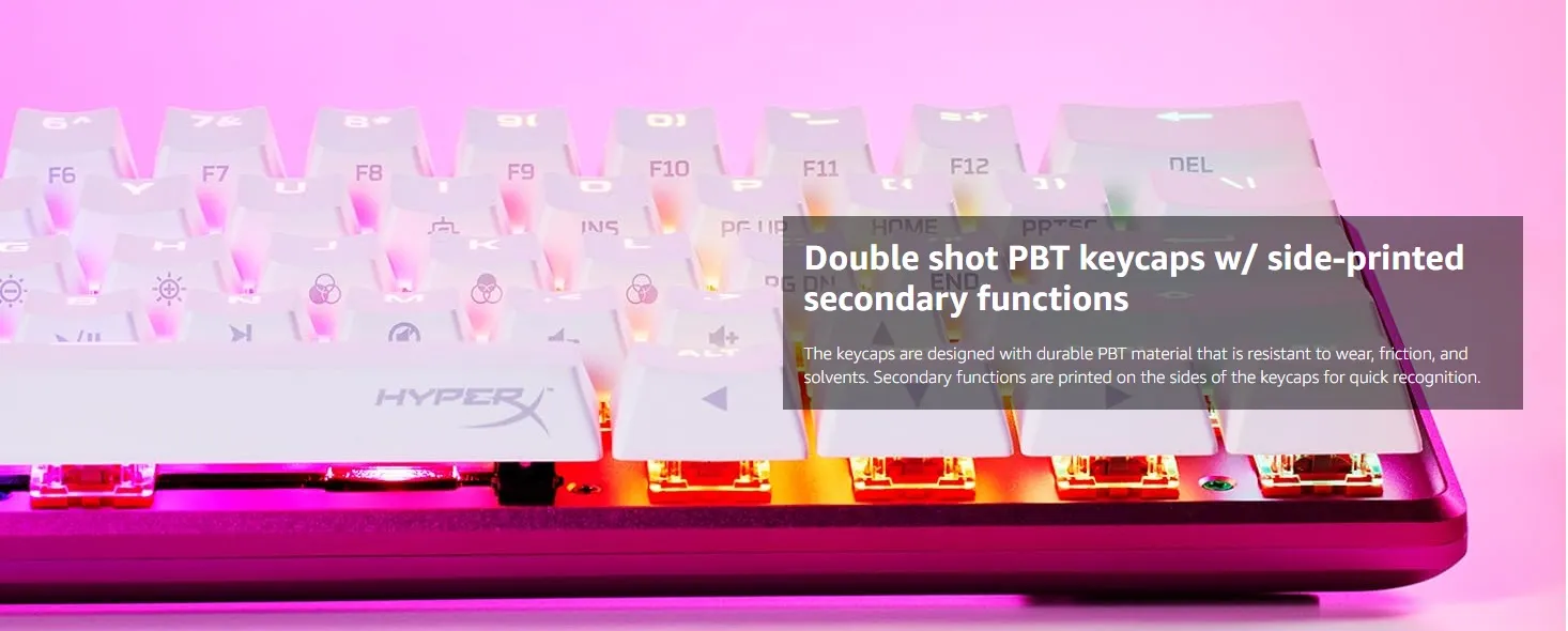 - Double shot PBT keycaps with side printing: The pre-installed PBT keycaps have text on the sides to help you quickly locate additional key functions.