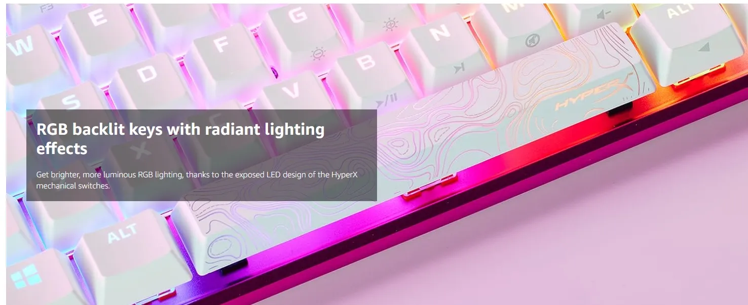 - RGB backlit keys with radiant lighting effects: Get brighter, more luminous RGB lighting, thanks to the exposed LED design of the HyperX mechanical switches.