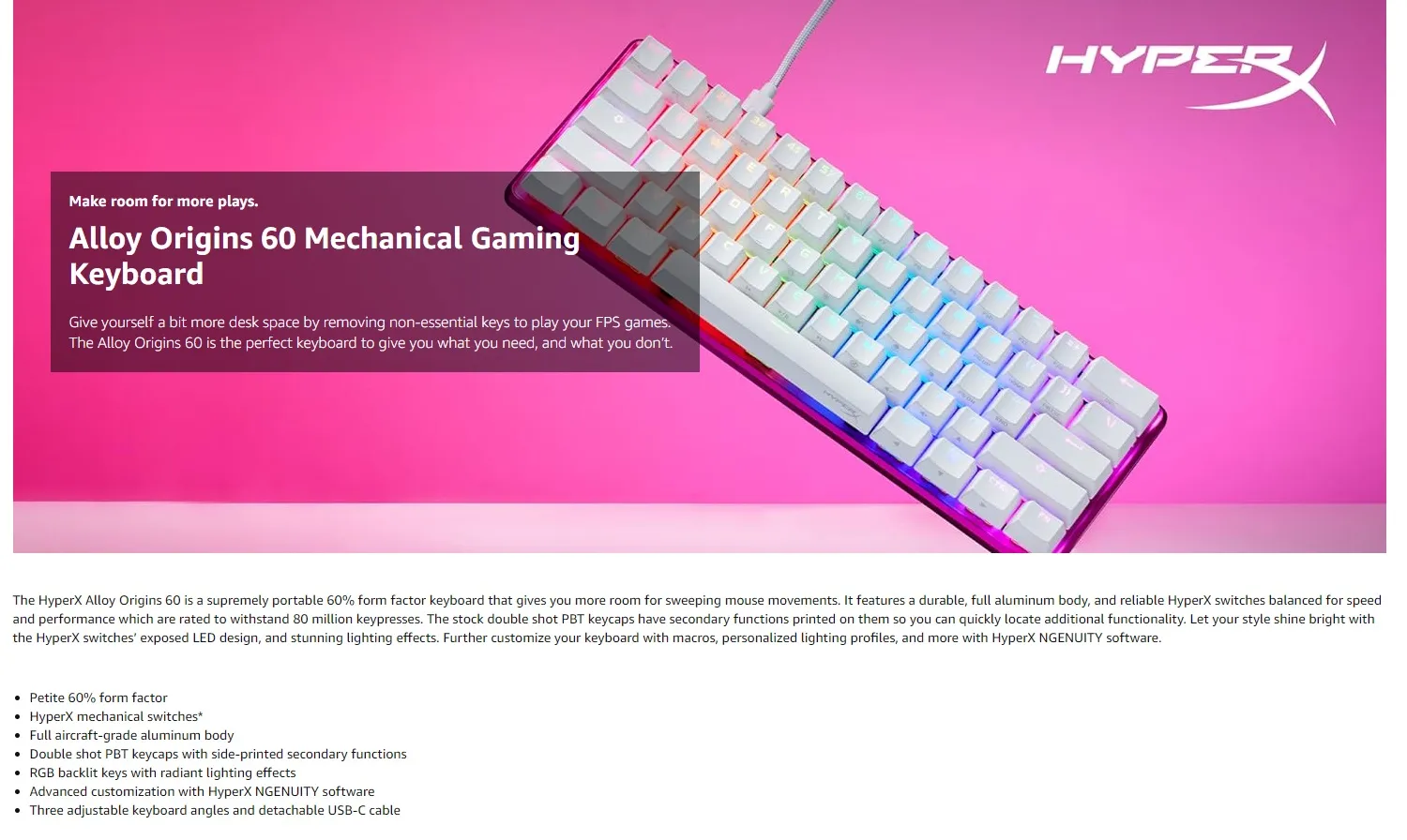 HyperX Alloy Origins 60 – Mechanical Gaming Keyboard – Ultra Compact 60% Form Factor – Linear Red Switch – Double Shot PBT Keycaps – RGB LED Backlit – NGENUITY Software Compatible – Pink