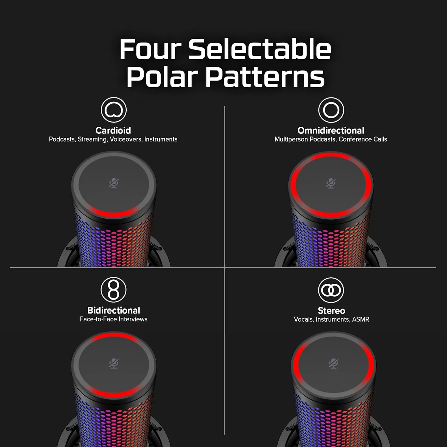 - Mic Status LED Indicators: Provides clear feedback on mic control mode, mute status, polar pattern, and volume levels.
