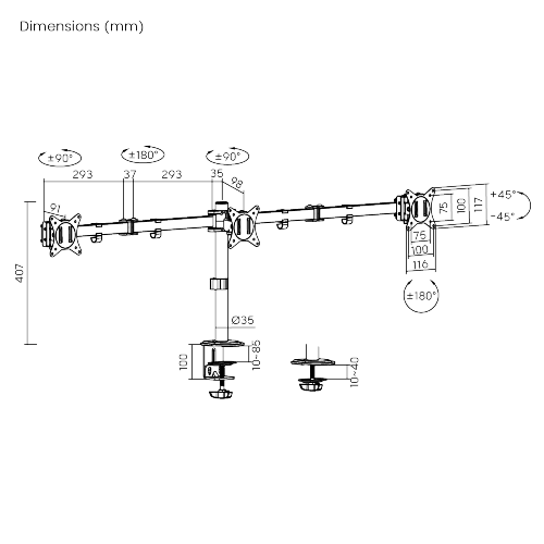| Suggested Desktop Thickness | Clamp:10~85mm Grommet:10~40mm (Clamp:0.39″~3.3″ Grommet:0.39″~1.6″) |