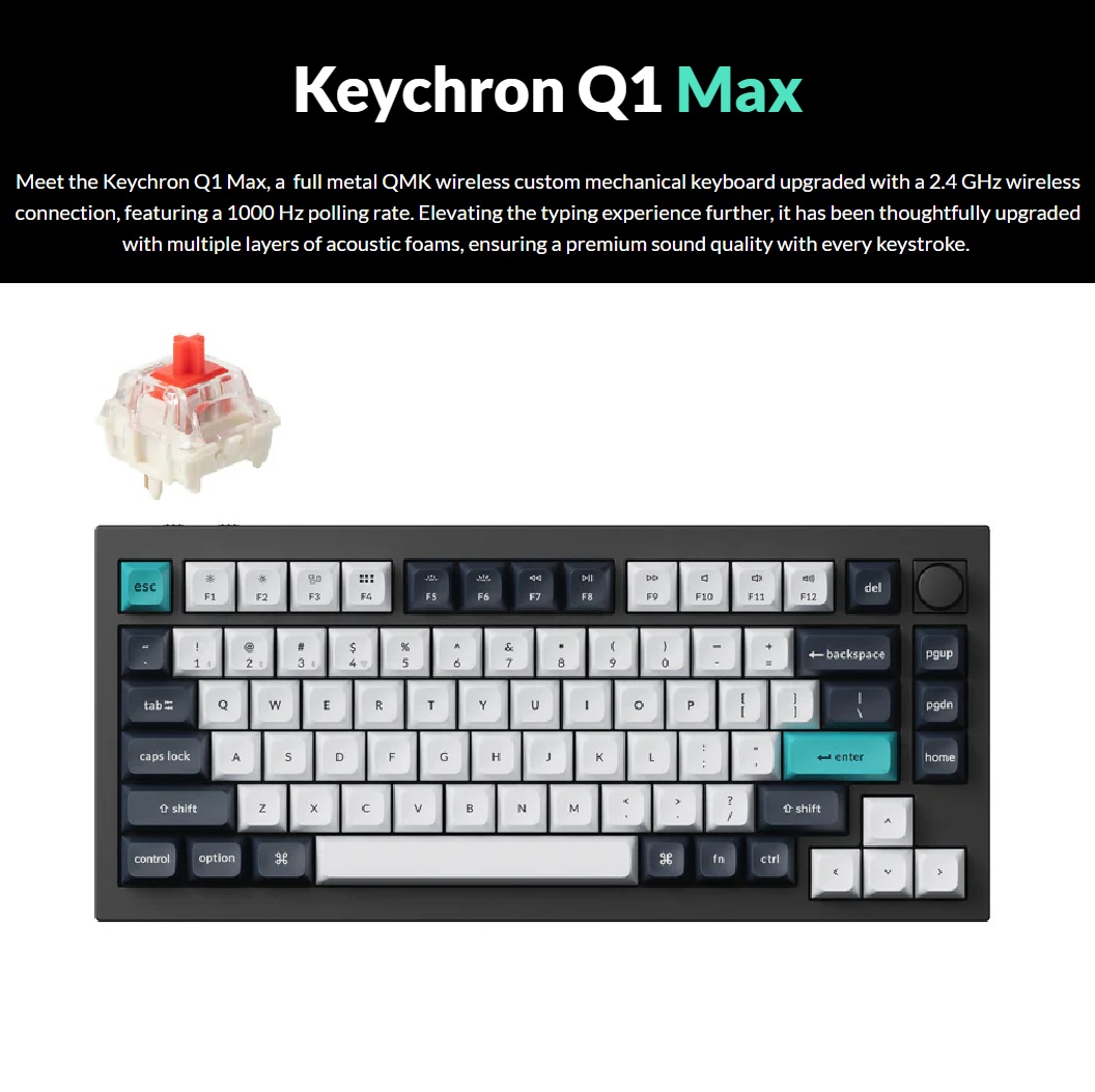 Keychron Q1 Max Hotswap Wireless RGB Mechanical Keyboard with Knob 75% Layout (84 Keys) , Aluminum Frame , 2.4 GHz Wireless Connection or Bluetooth 5.1 or Type-C wired Connectivity , Gateron Jupiter Red Switches , KSA Double-shot PBT Keycaps , Windows Mac OS | Q1M-M1 | Open Box