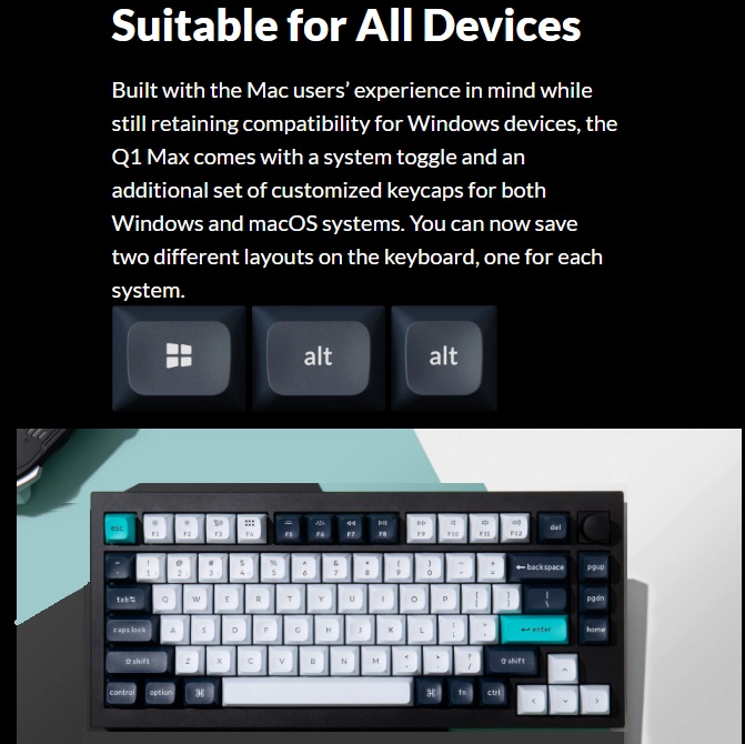 • 【Multi-Device Compatibility】Tailored for both Mac and Windows users, the Q1 Max comes with customizable keycaps for each system, allowing you to save two different layouts directly on the keyboard.