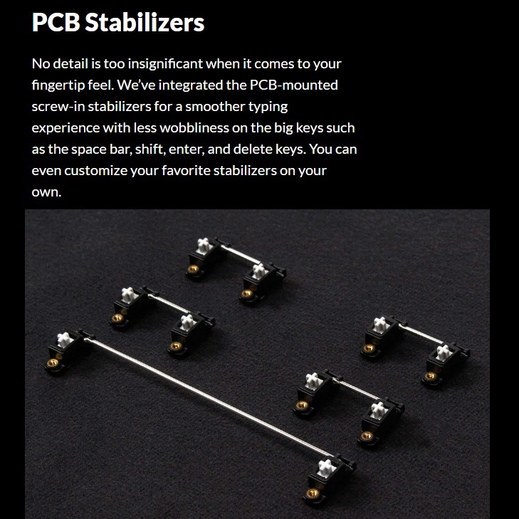 • 【Enhanced Stabilizers】Integrated PCB-mounted screw-in stabilizers ensure a smoother typing experience with reduced wobbliness on large keys, offering enhanced stability and precision