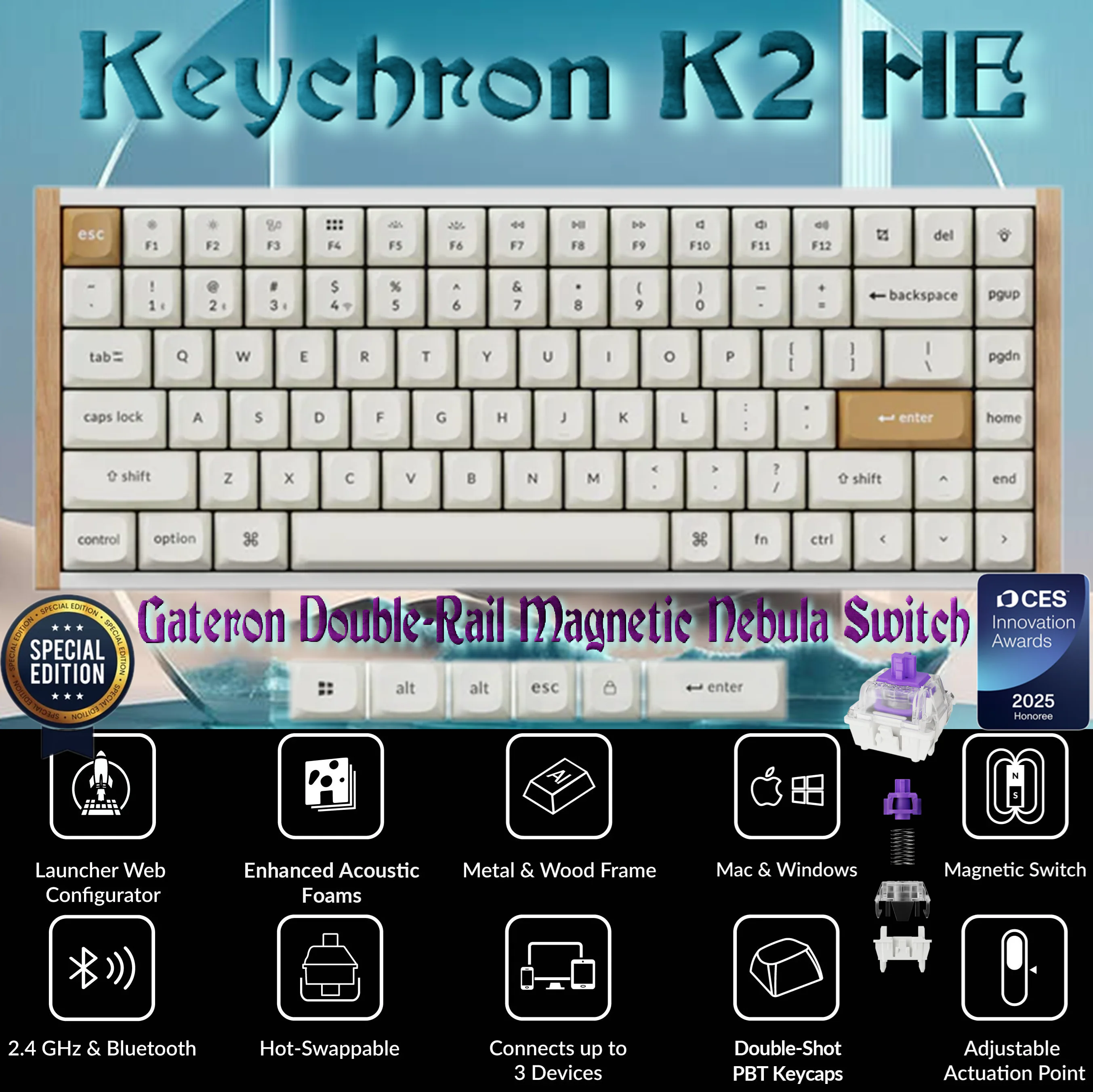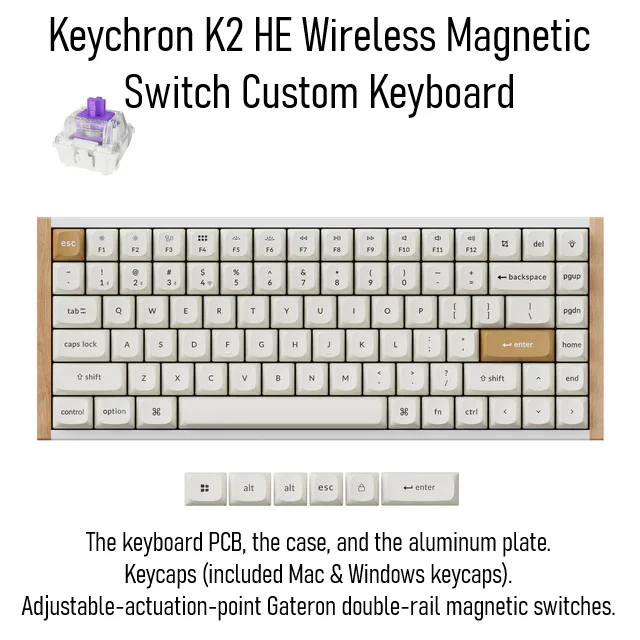 Keychron SPECIAL EDITION K2 HE Wireless 75% Magnetic Switch Keyboard With Gateron Double-Rail Nebula Switches, Dynamic Trigger, Analog Mode, Rapid 1000Hz Polling, Hot-Swappable Aluminum & Rosewood Frame , Additional Keycaps for Windows/macOS/Linux | WHITE K2H-Q1