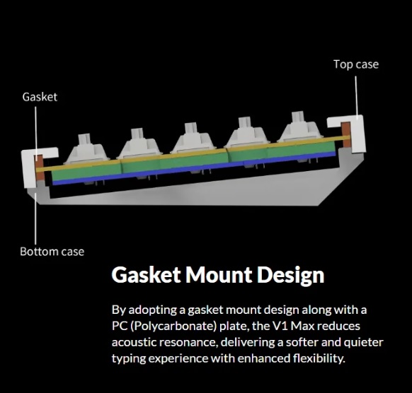 By adopting a gasket mount design along with a PC (Polycarbonate) plate, the V1 Max reduces acoustic resonance, delivering a softer and quieter typing experience with enhanced flexibility.