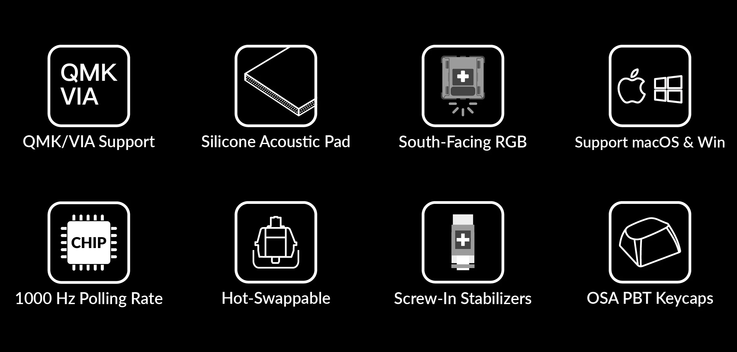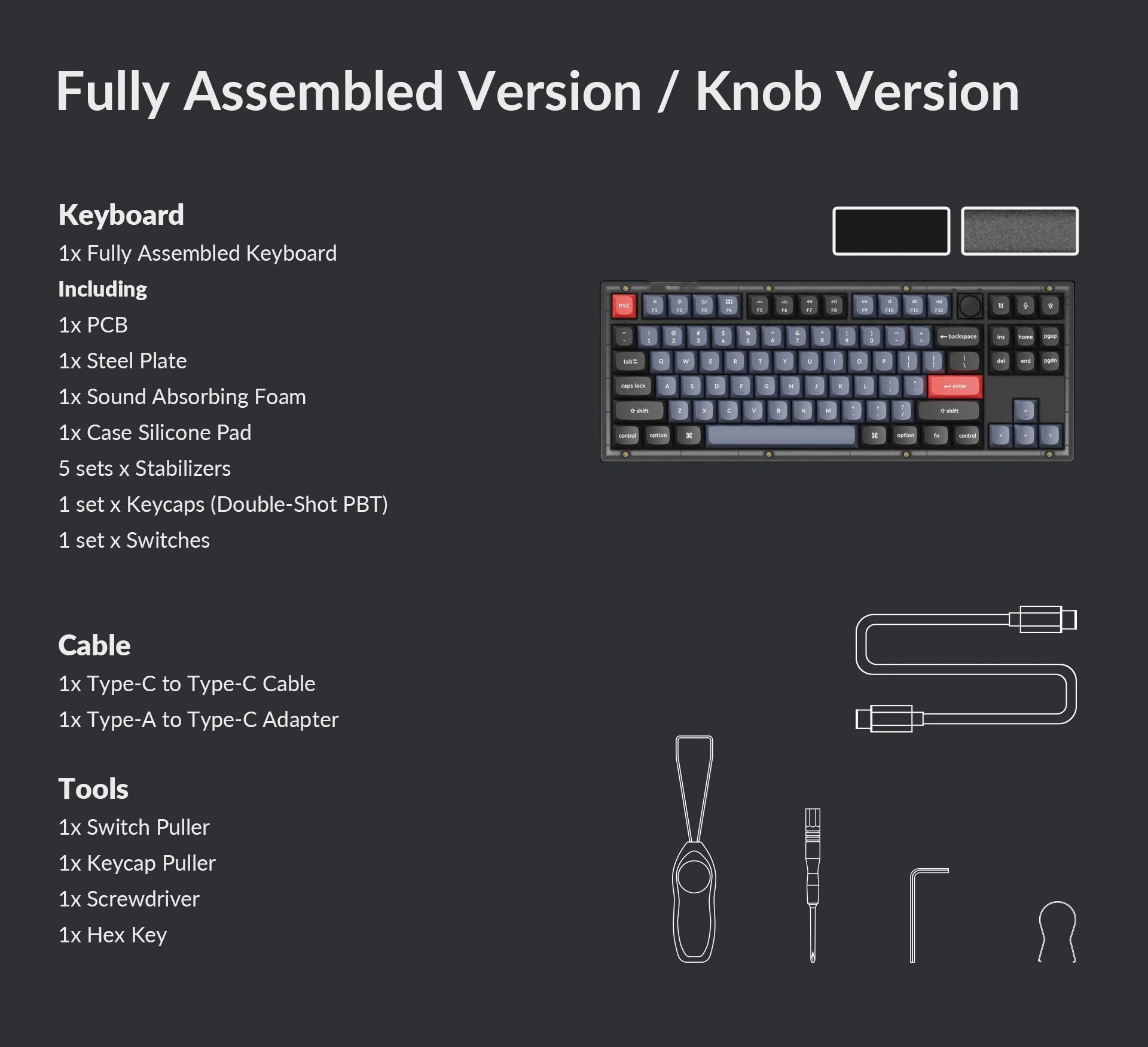| Keycaps (Fully Assembled Version) | Double-shot PBT keycaps, not shine-through, OSA Profile (OEM height, SA shape) |