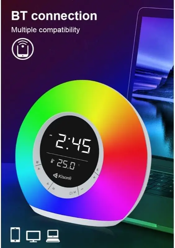 A Bluetooth speaker, alarm clock, FM radio, and RGB night light in one sleek device. Designed for bedrooms, offices, travel, and parties. - 5W Full-Range Speaker with Built-in Microphone