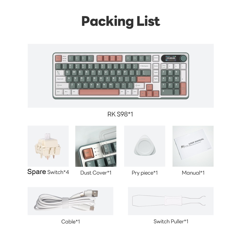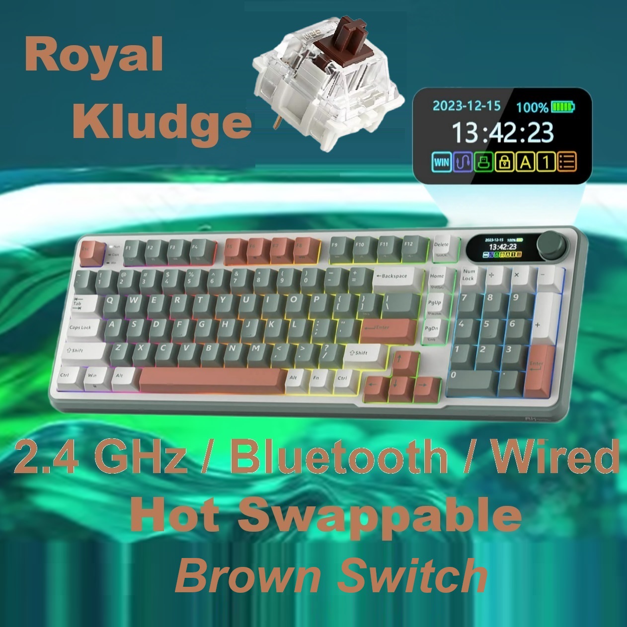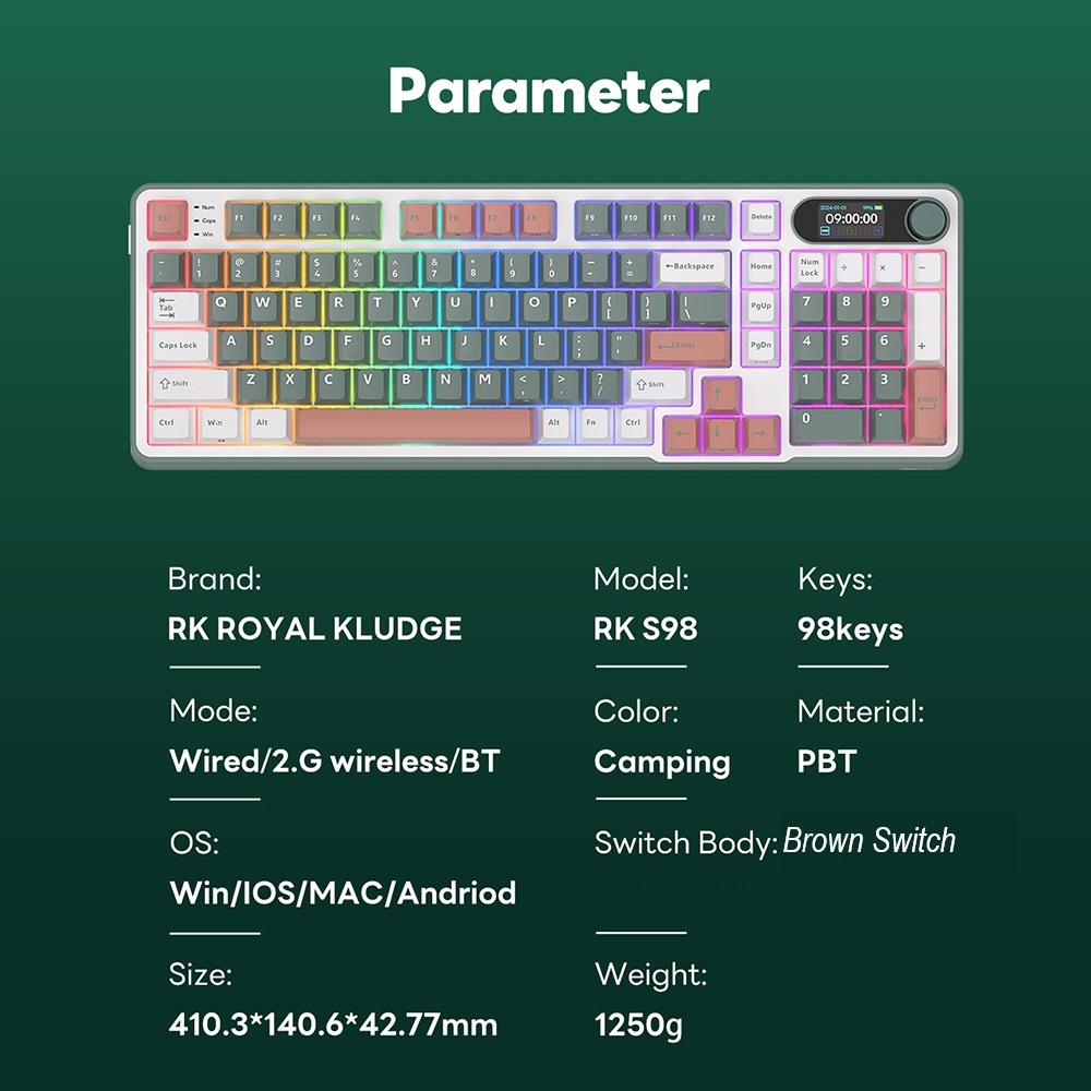 RK ROYAL KLUDGE RKS98 Mechanical Keyboard w/Smart Display & Knob, Top Mount 96% Wireless Mechanical Keyboard BT/2.4G/USB-C, Hot Swappable, Software Support, Massive Battery, 98 Keys Brown Switch . WIN-iOS-MAC-ANDROID