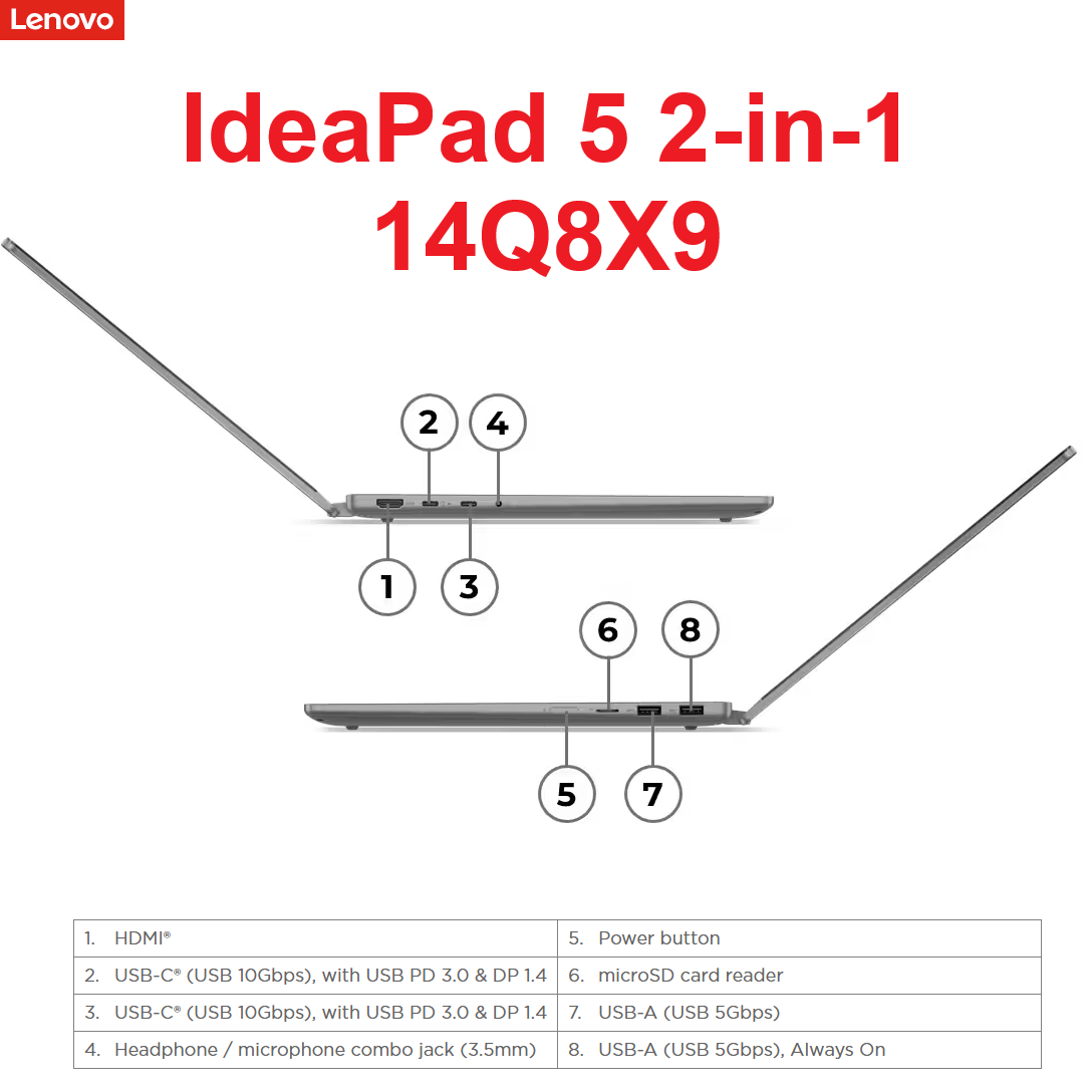 Various docking solutions are supported via USB-C®. For more compatible docking solutions, please visit Docking for IdeaPad® 5 2-in-1 14Q8X9