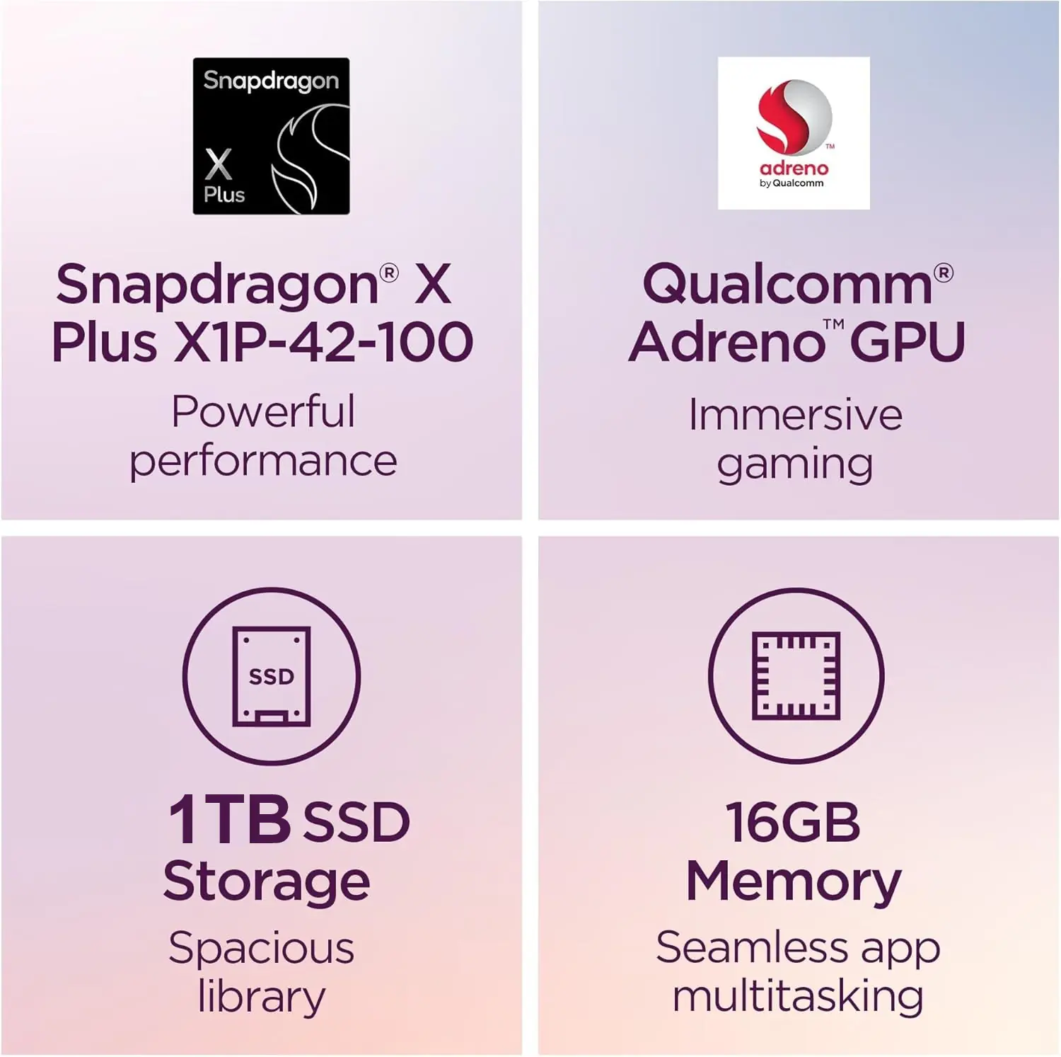 - Processor : Snapdragon® X Plus X1P-42-100, 8C, Max Turbo up to 3.4GHz (single-core) / 3.2GHz (multi-core), 30MB