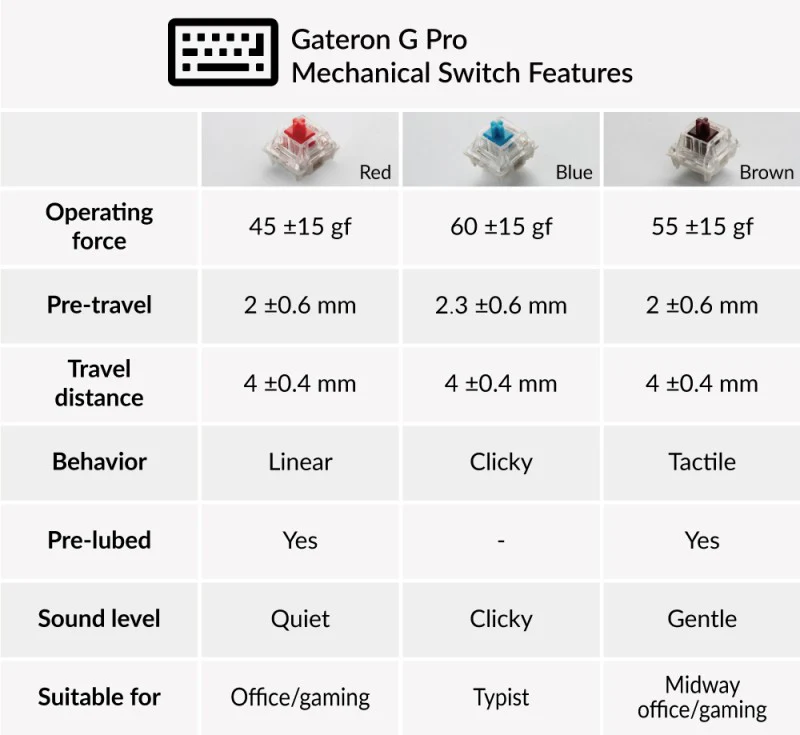 - Gateron G Pro Mechanical: Red switches with 50 million keystroke lifespan.