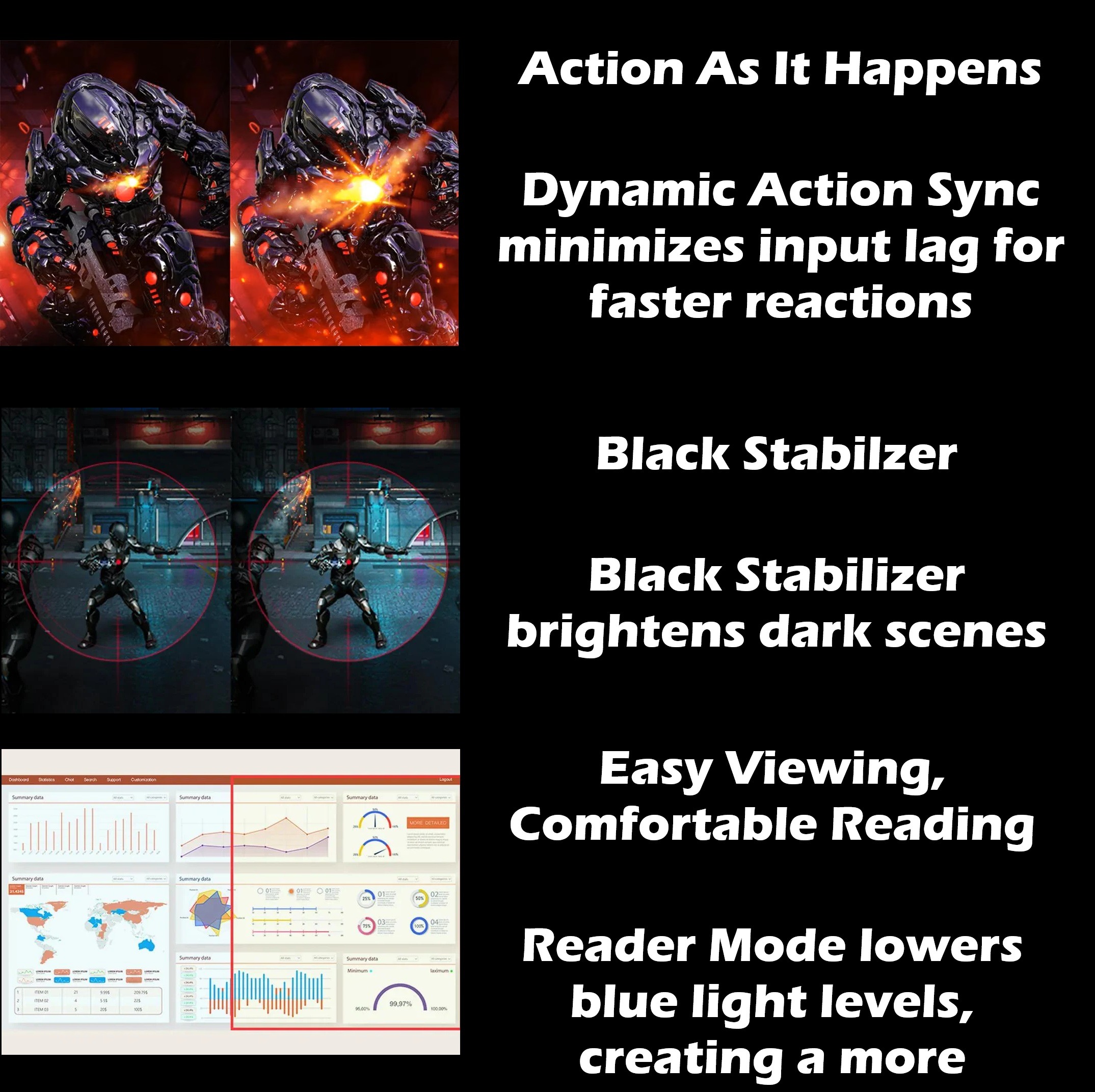 - 1ms Motion Blur Reduction For Cleaner Fast Scenes : Motion Blur Reduction technology minimizes ghosting and blur during rapid movement, keeping action sharp when things get hectic.