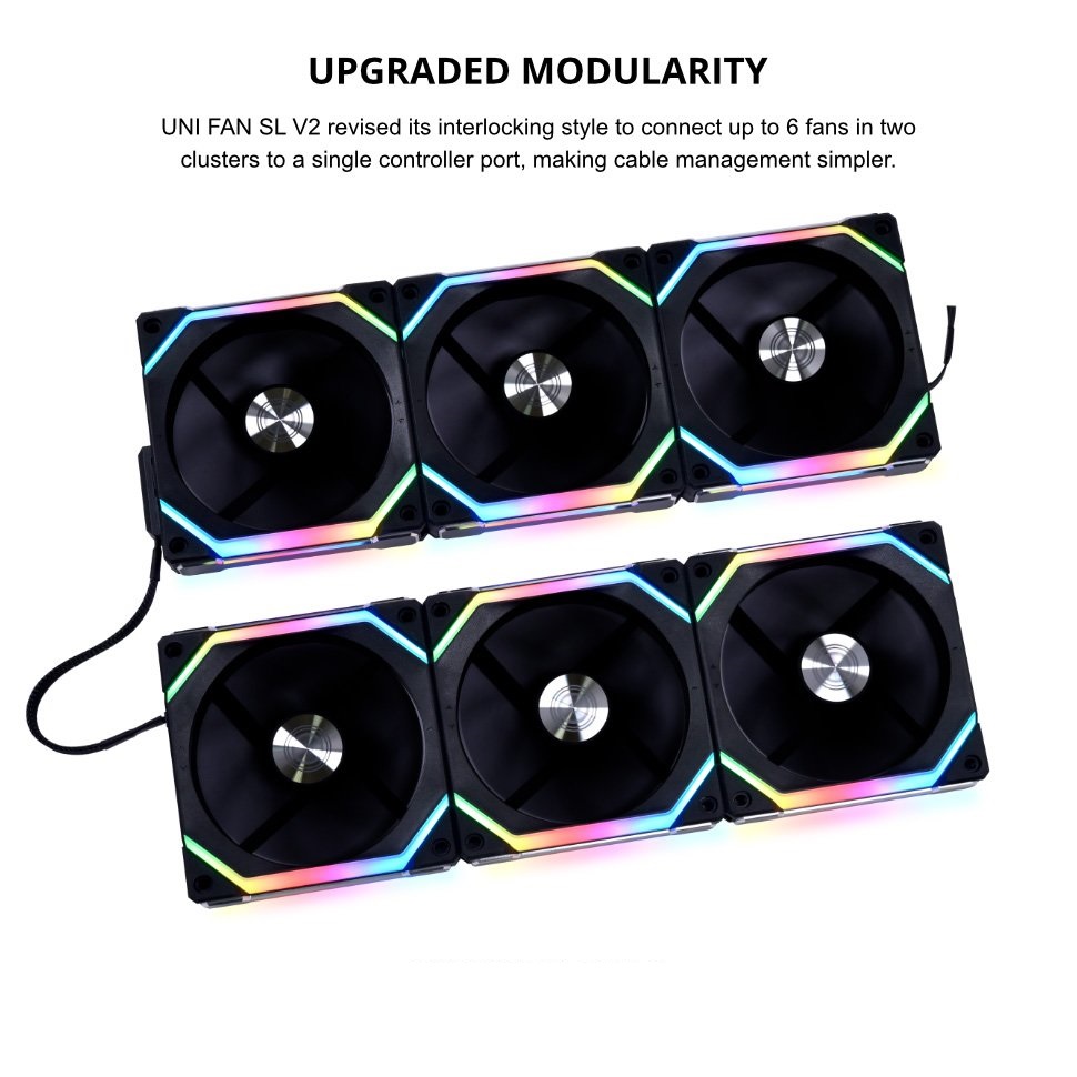 - UPGRADED MODULARITY – revised the interlocking style to connect up to 6 fans in two clusters to a single controller port, making cable management simpler