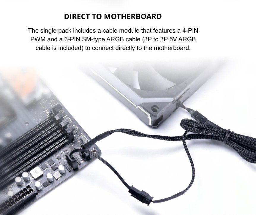 - PLUG-IN POWER CABLE MODULE – The cable module is designed to plug in and sit flush with the fan frame, which doesn’t require extra space for the module and reduces clearance issues with radiator fittings.