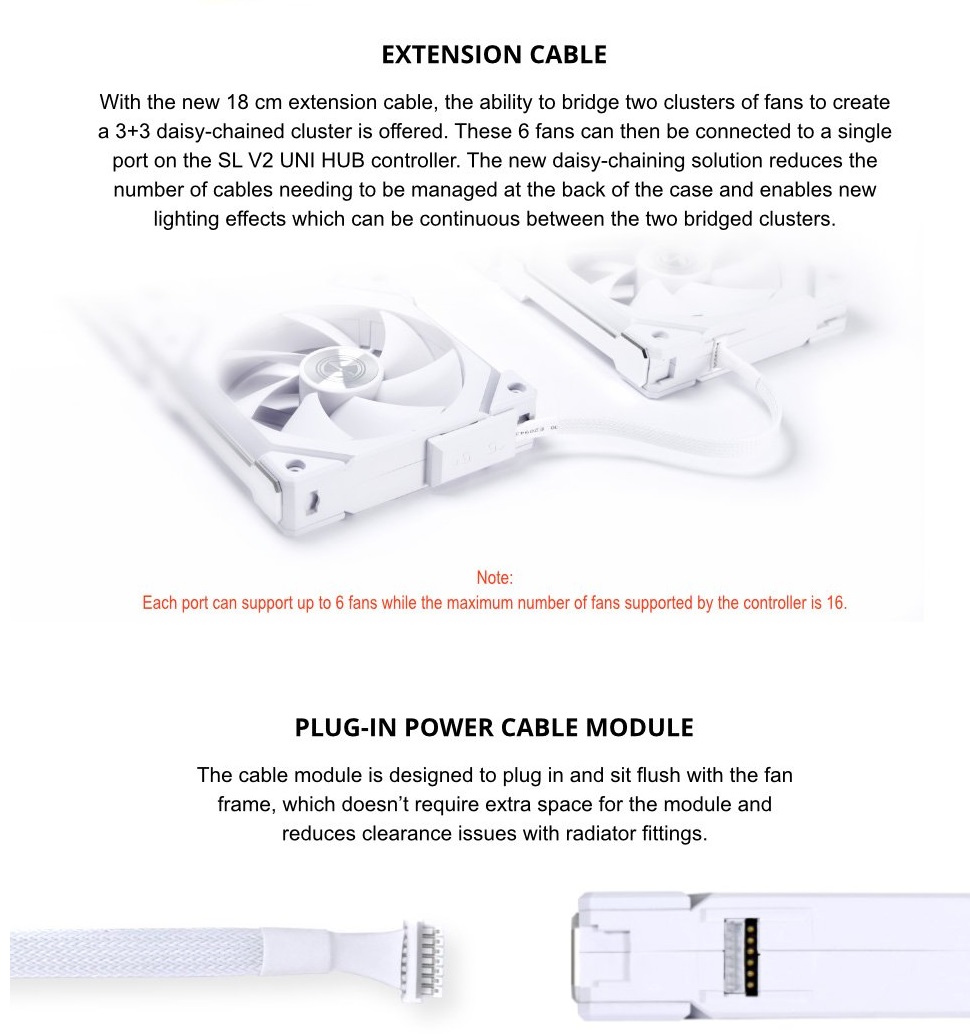 - EXTENSION CABLE – With the new 18 cm extension cable, the ability to bridge two clusters of fans to create a 3+3 daisy-chained cluster is offered.