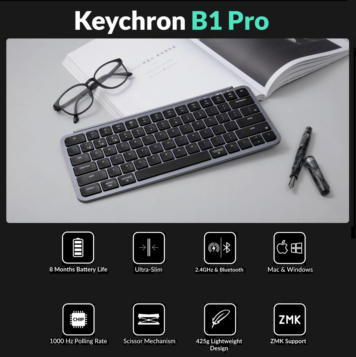 Keychron B1 Pro Lightweight Ultra-portable Compact 75% Keyboard with 2.4 GHz / BT / Type-C Wired Connectivity ; Extended Battery Life ; 12 Multimedia Keys & Quick Emoji Access ; Concave Ergonomic Keys ; Supports macOS / Windows / Linux | SPACE GREY B1P-K1