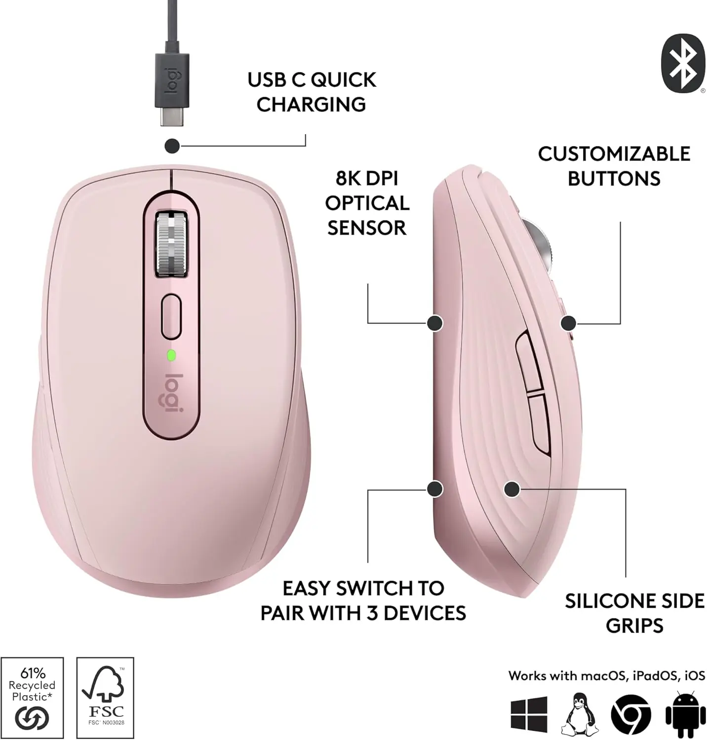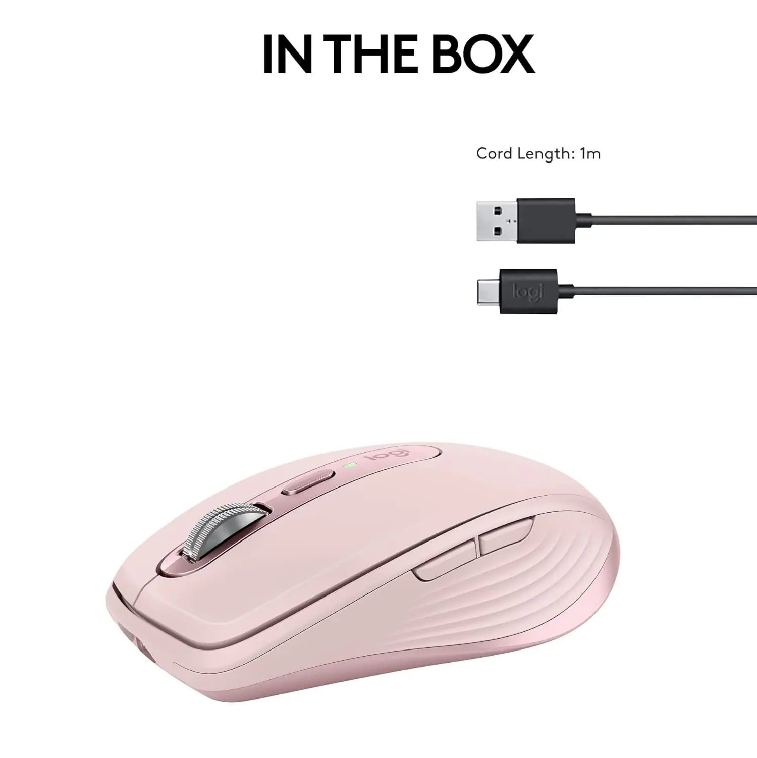 Logitech MX Anywhere 3S – Ultra-Precise 8K DPI Mouse Any-Surface Tracking, MagSpeed Scroll, USB-C Rechargeable, Quiet Clicks, Bluetooth Only, Up to 3 Devices At The Same Time, Works on Glass, Programmable Buttons, Win/macOS/ChromeOS/Linux | ROSE PINK