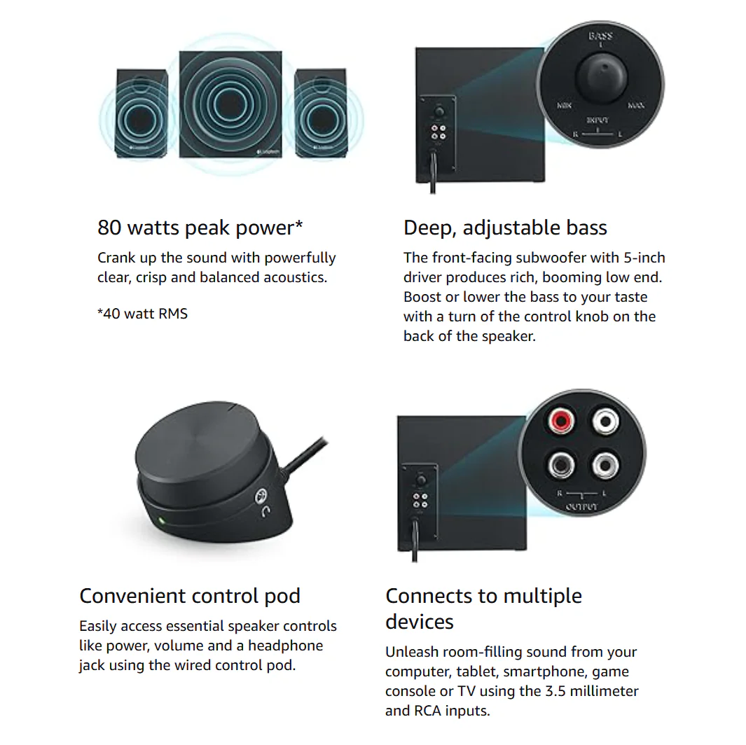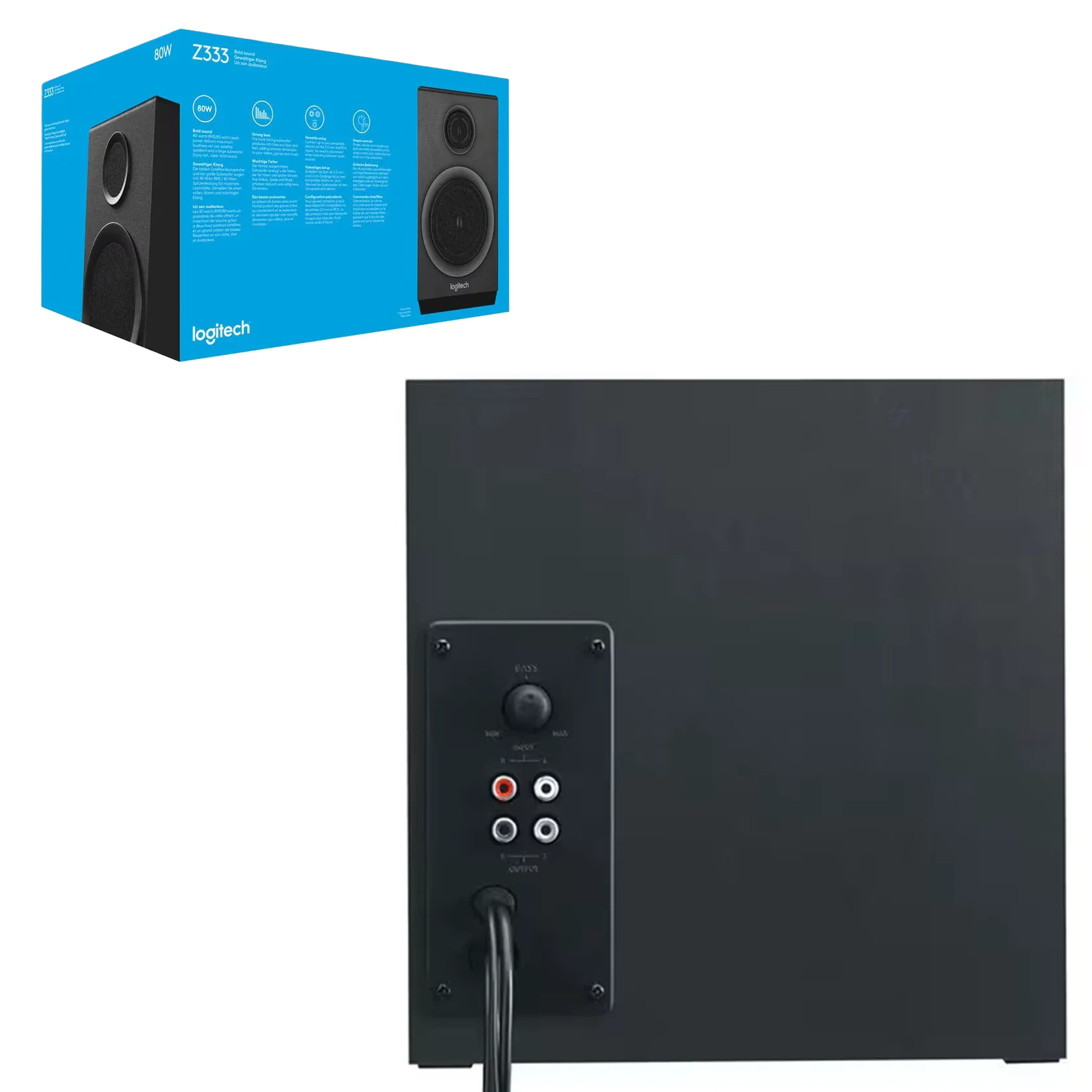 Logitech Z333 2.1-Channel Bold Speaker System , 80W Peak Power , 5.25″ Subwoofer , Adjustable Bass, Dual 3.5mm & RCA Inputs , Wired Control Pod , Deep, Clear Audio for PC & TV