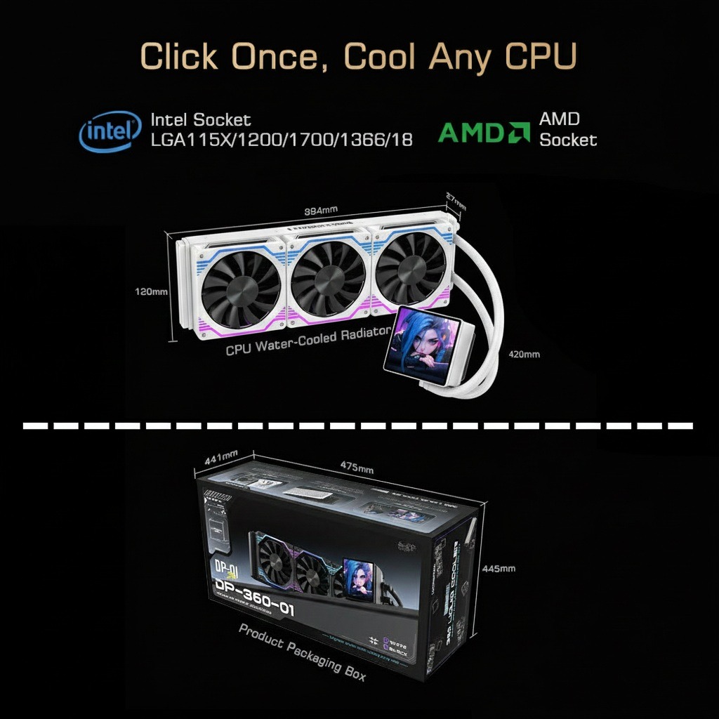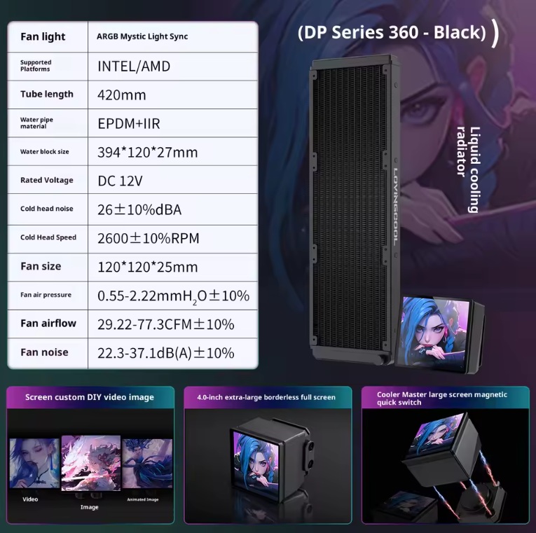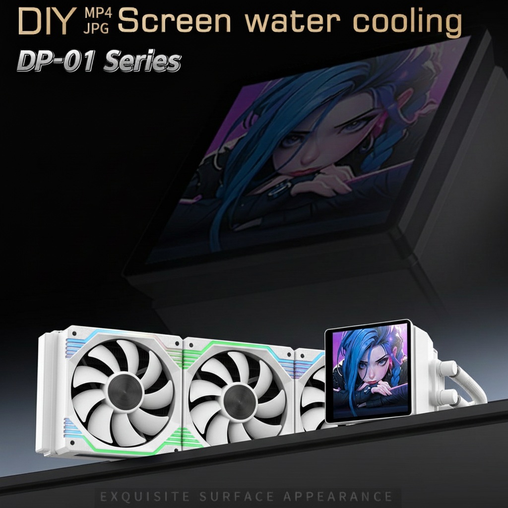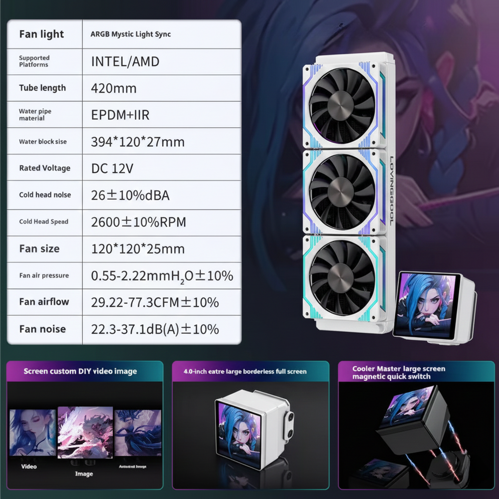 LOVINGCOOL DP-360-01 Liquid Cooler With 4.0-inch Magnetic Large Screen Supports MP4 -JPG-GIF , 3x 120mm PWM ARGB 5V Fan With Infinity Mirror Design , 2600 RPM Pump Speed , 67 CFM , 26dBA | WHITE