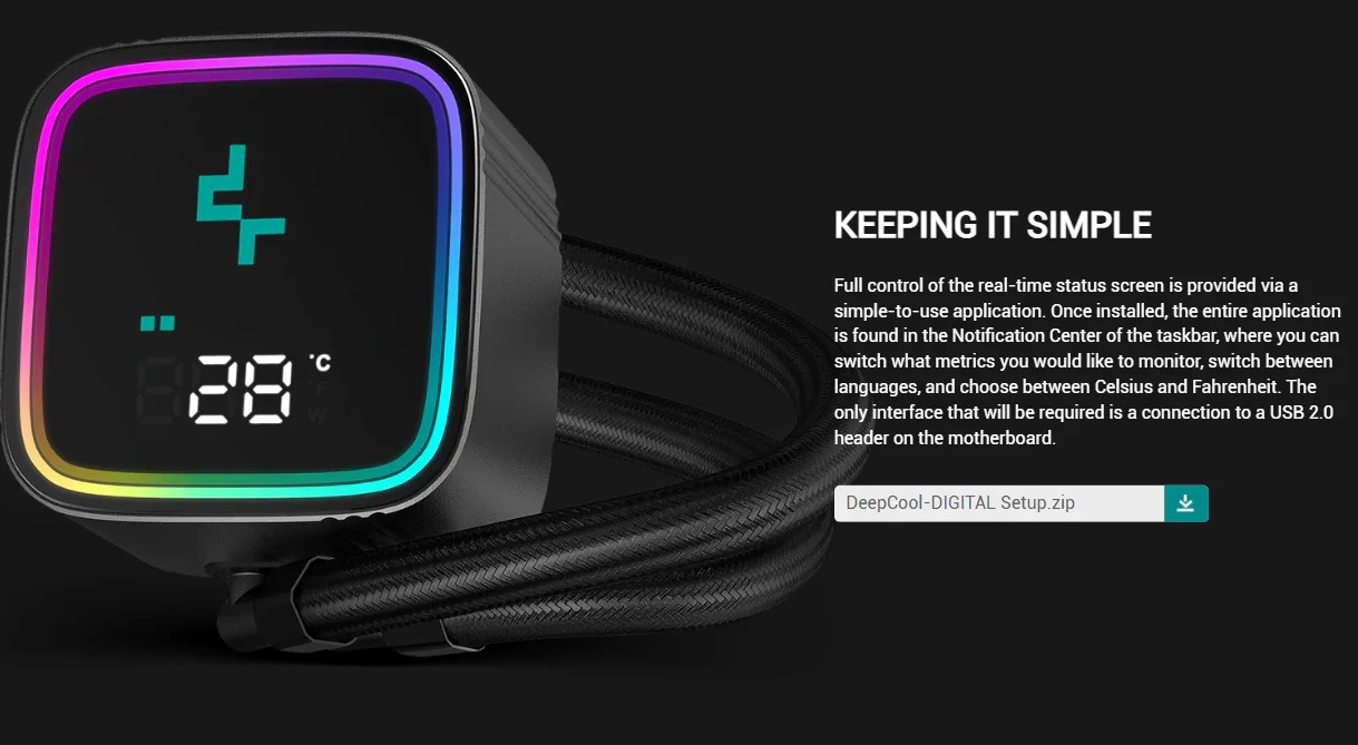 - The digital display screen can be easily controlled through a simple and easy-to-use application. Once installed, you can find the digital display app in the Notification Center of the taskbar and switch the metrics you want to monitor, with support for Celsius and Fahrenheit unit switching. The only port is the USB 2.0 port that needs to be connected to the motherboard.