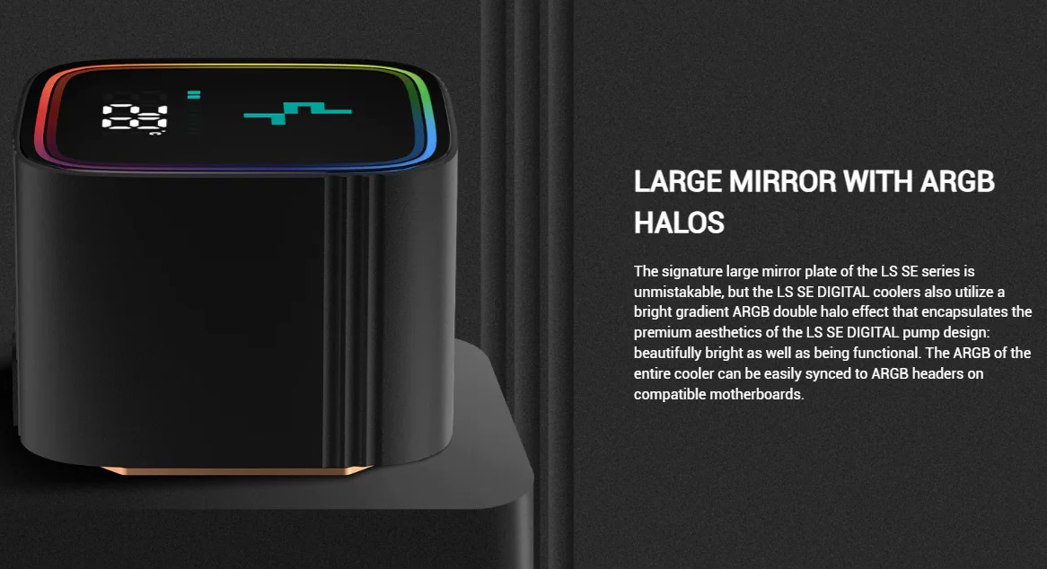 - The signature large mirror plate of the LS SE series is unmistakable, but the LS SE DIGITAL coolers also utilize a bright gradient ARGB double halo effect that encapsulates the premium aesthetics of the LS SE DIGITAL pump design: beautifully bright as well as being functional.
