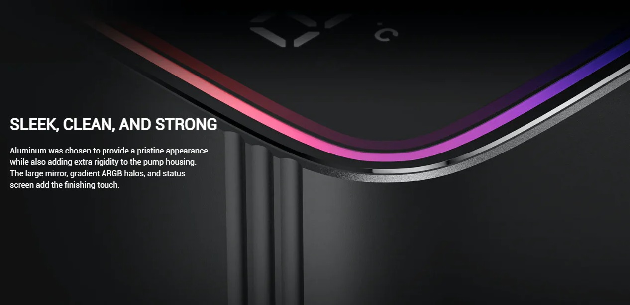 - Aluminum was chosen to provide a pristine appearance while also adding extra rigidity to the pump housing. The large mirror, gradient ARGB halos, and status screen add the finishing touch.