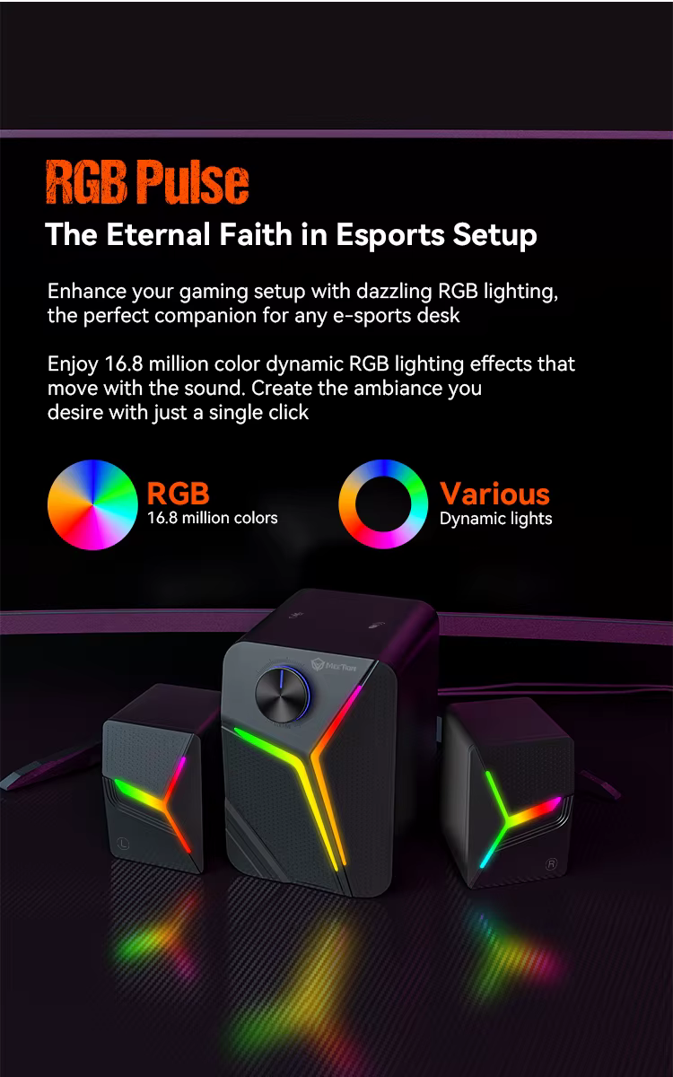 Balanced stereo sound with deep low-end frequencies and well-defined mids and highs, perfect for gaming, music, and movies. - Dynamic RGB Pulse Lighting