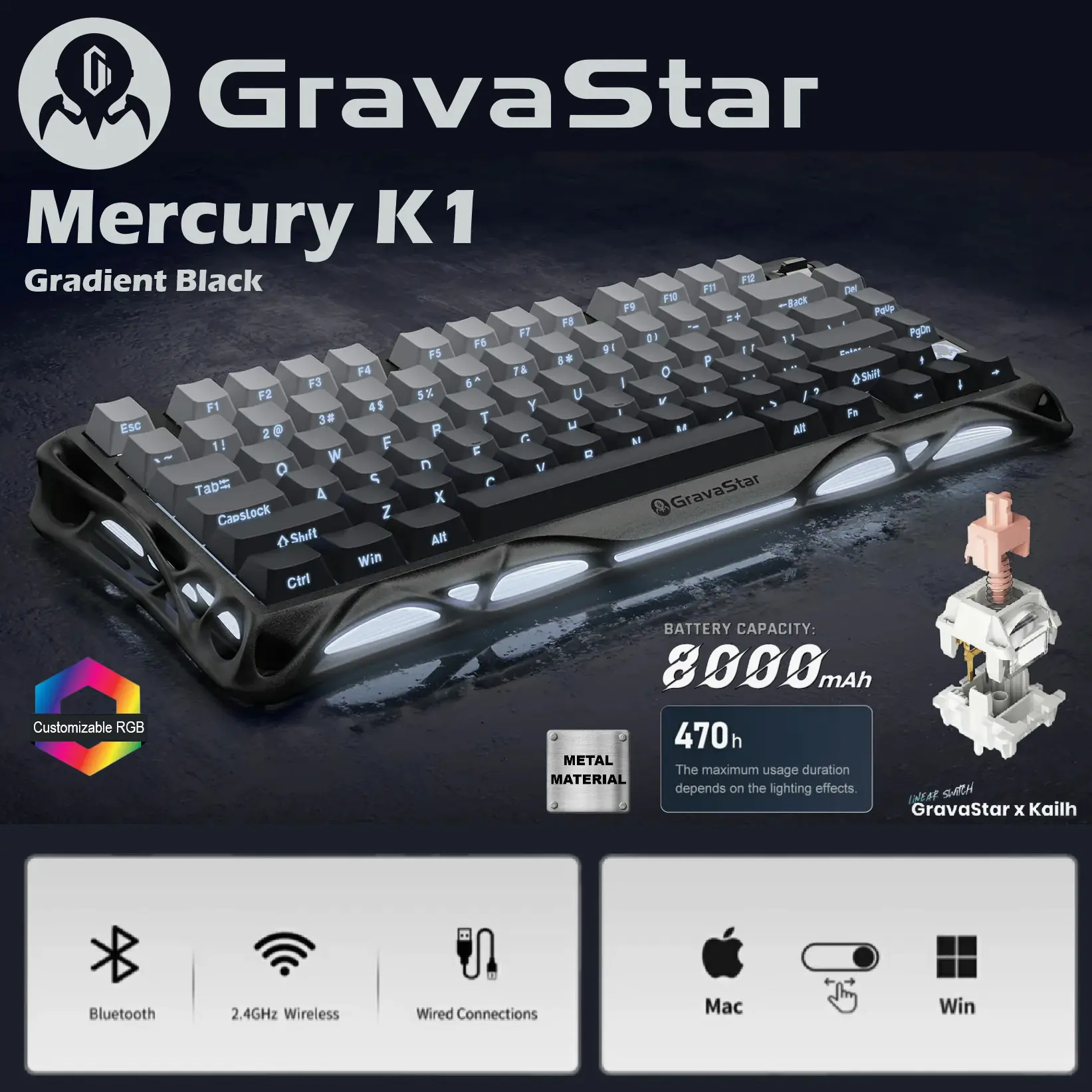 GravaStar Mercury K1 – 75% Wireless Mechanical Gaming Keyboard With Aluminum Alloy Exoskeleton, Hot-Swap Sockets, Kailh Linear Switches, Dual RGB, & 8000mAh Battery | Gradient Black