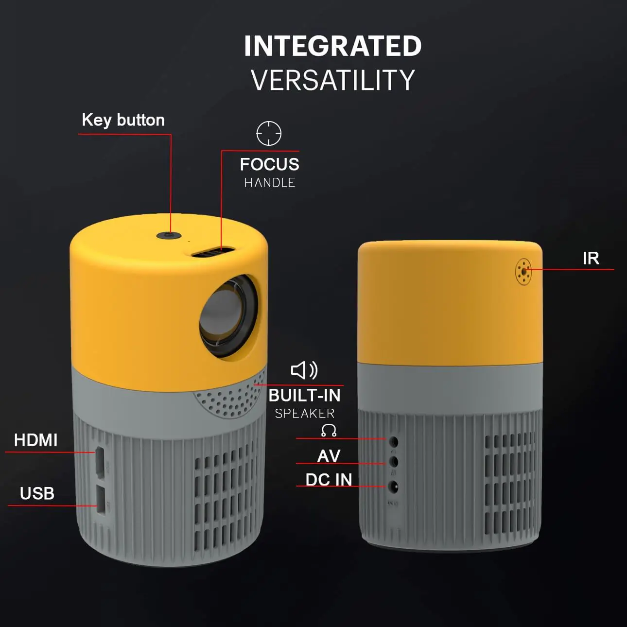 Mini LED Projector – USB2.0, 480×360 Native Resolution, 1080P Support, HDMI/AV, 30,000h LED, Manual Focus – Yellow-Grey