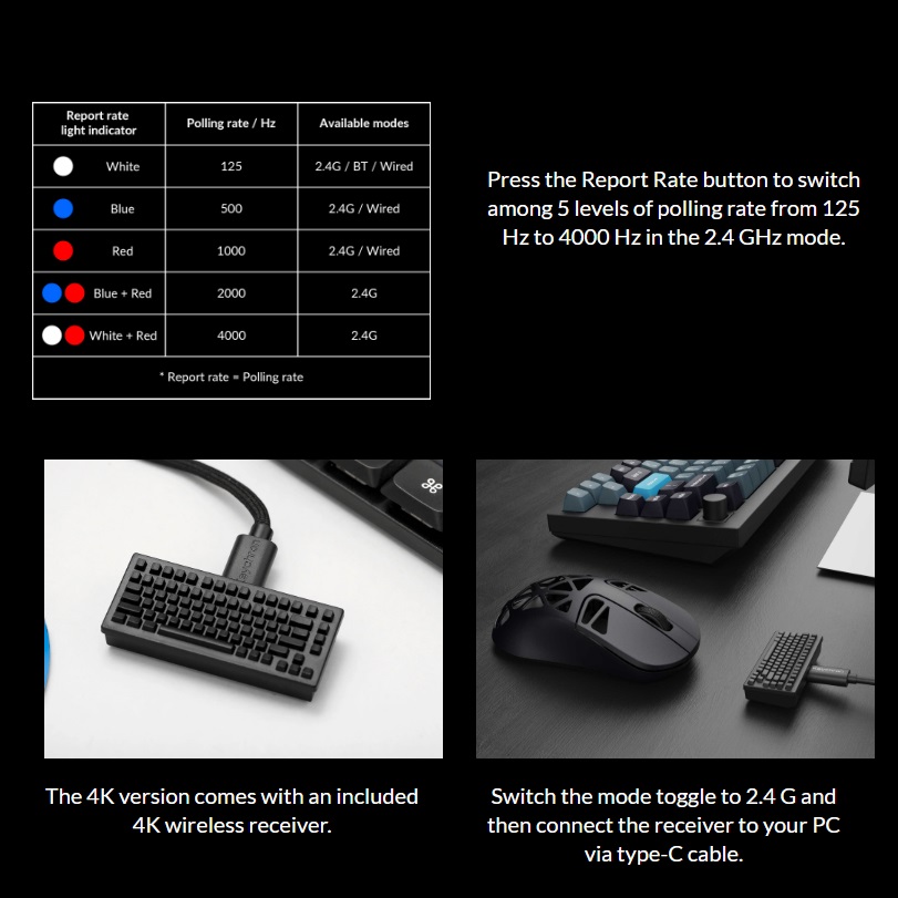 | Polling Rate | 4000 Hz (2.4 GHz mode) 1000 Hz (Wired mode) 125 Hz (Bluetooth mode) |